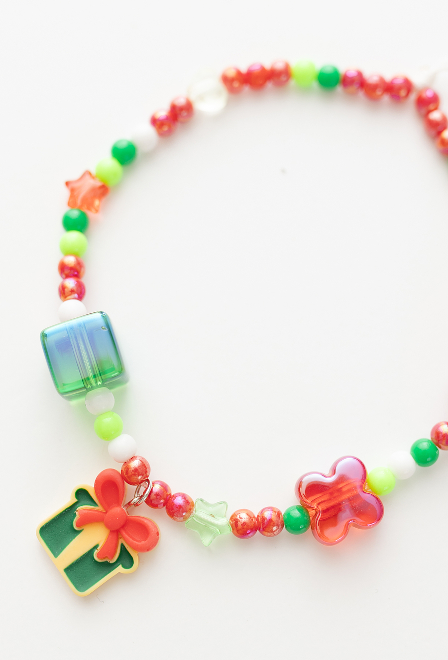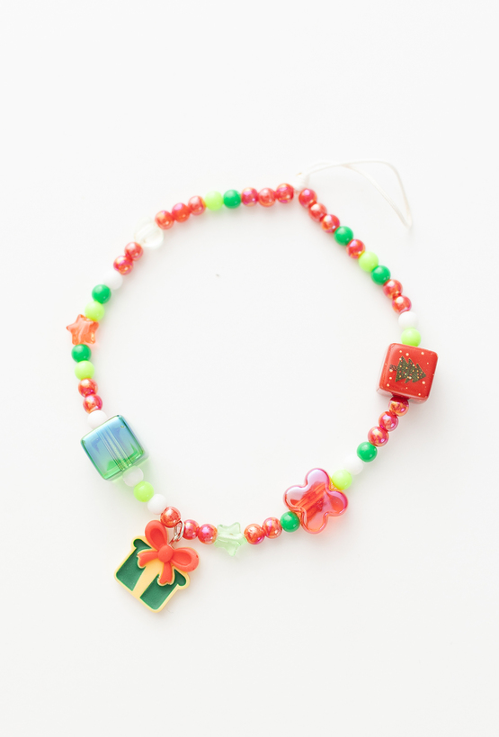 Nadaj magii każdej dziecięcej stylizacji dzięki tej uroczej, świątecznej bransoletce!. Zaprojektowana specjalnie z myślą o dziewczynkach, zachwyca kolorowymi koralikami i uroczymi zawieszkami w kształcie prezentu, choinki czy gwiazdek. Elastyczna gumka zapewnia łatwe zakładanie i komfort noszenia, a świąteczne kolory – czerwony, zielony i złoty – idealnie pasują do bożonarodzeniowych stylizacji. To doskonały pomysł na drobny prezent, upominek mikołajkowy czy dodatek do świątecznego stroju.
