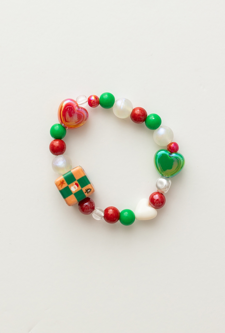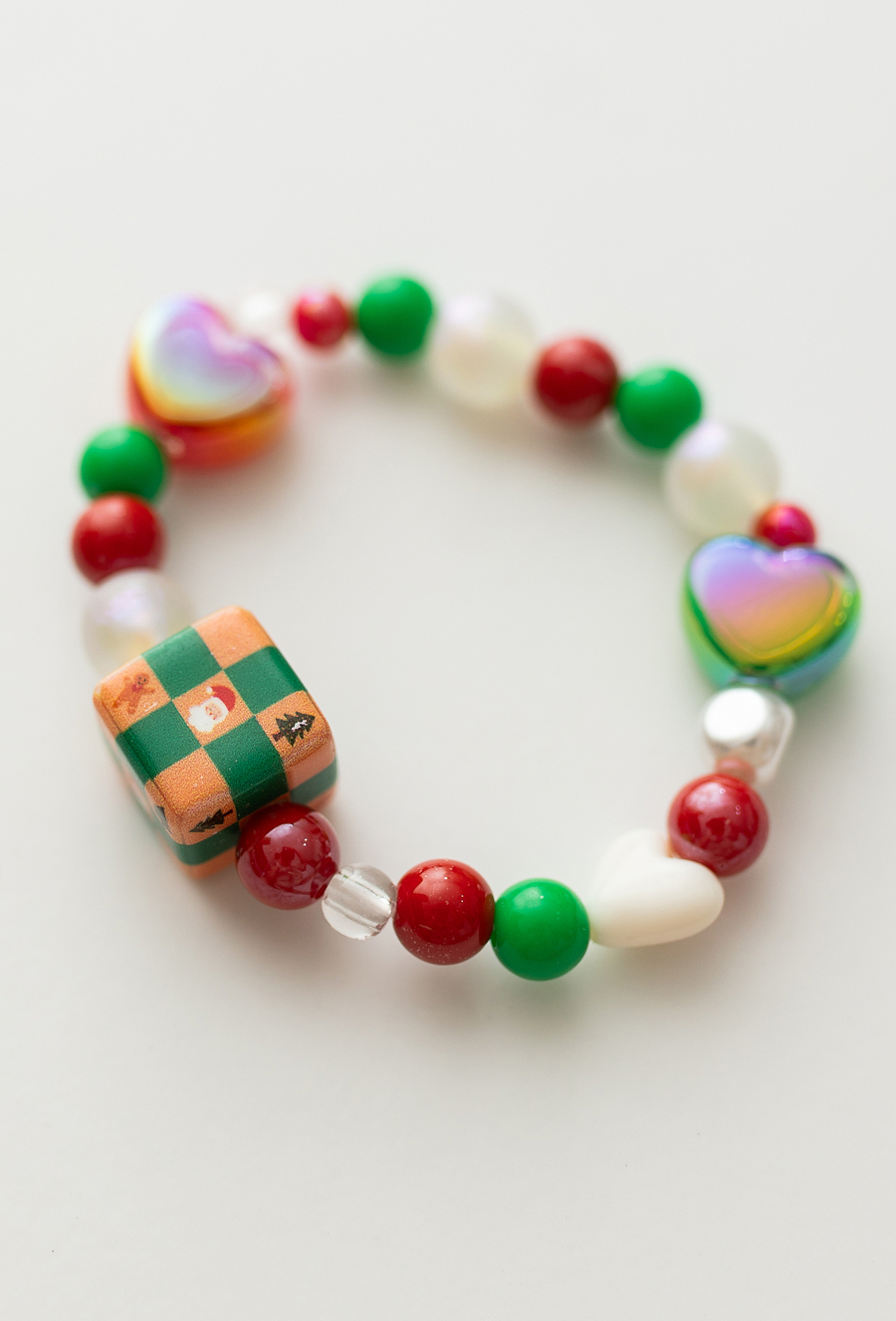 Kolorowa bransoletka dla dziewczynki wykonana z ozdobnych koralików w świątecznych barwach – czerwieni, zieleni, bieli i złota. Dekorowana serduszkami oraz kostką z bożonarodzeniowym motywem, jest elastyczna i wygodna w noszeniu. Doskonała jako dodatek do świątecznych stylizacji, na jasełka, rodzinne przyjęcia czy zimowe sesje zdjęciowe.