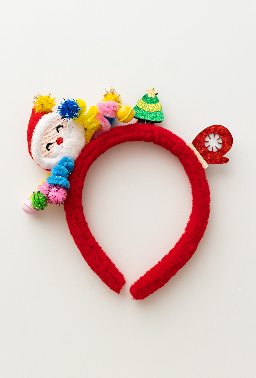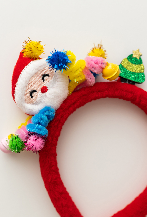 Świąteczna opaska dla dziewczynki w intensywnie czerwonym kolorze, ozdobiona miękkim pluszowym Mikołajem, miniaturową choinką i błyszczącymi dekoracjami. Wykonana z miękkiego materiału, który zapewnia wygodę noszenia, doskonale trzyma włosy i nadaje stylizacji radosny, bożonarodzeniowy charakter. Sprawdzi się na jasełkach, świątecznych przyjęciach, rodzinnych spotkaniach i do pamiątkowych zdjęć.
