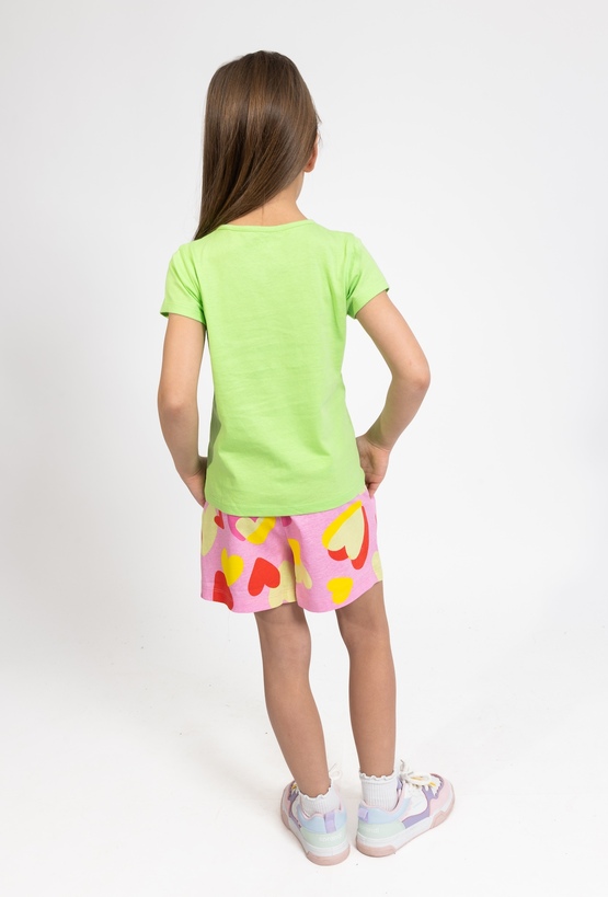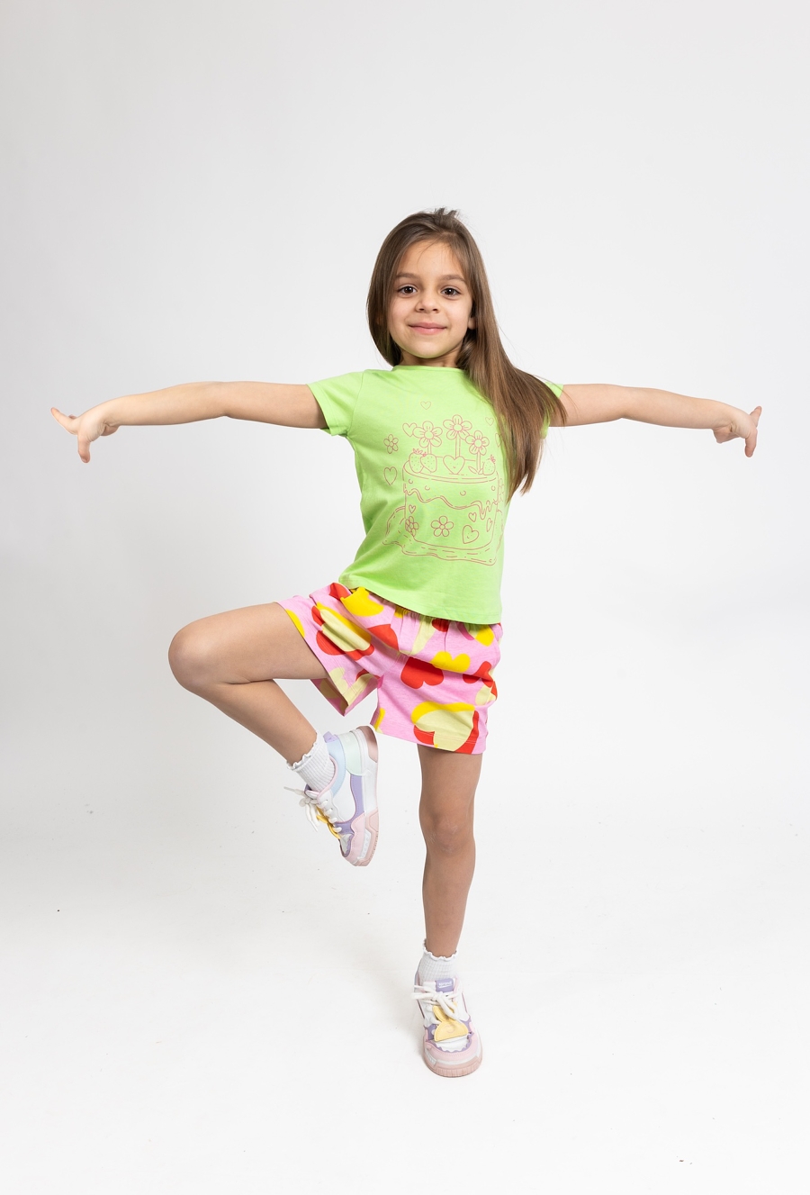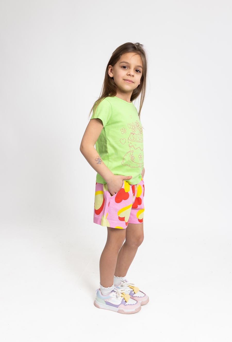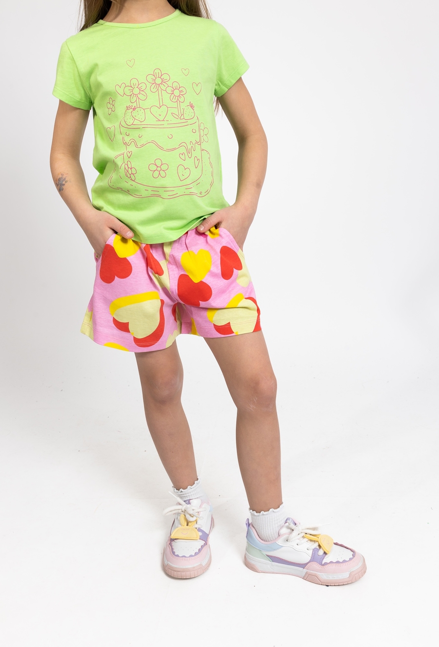 Te urocze szorty o długości 1/2 to doskonała propozycja na ciepłe, letnie dni, łącząca praktyczny fason z modnym designem. Utrzymane w dziewczęcej, różowej kolorystyce, zostały w całości pokryte radosnym nadrukiem w serca, który nadaje całości wyjątkowego, wakacyjnego charakteru. Dzięki elastycznemu materiałowi szorty świetnie dopasowują się do sylwetki, zapewniając dziecku pełną swobodę ruchów podczas zabawy na świeżym powietrzu. To idealna baza do wielu letnich stylizacji – doskonale komponują się zarówno z prostymi t-shirtami, jak i lekkimi bluzkami, tworząc zestaw, w którym każda dziewczynka będzie wyglądać modnie i czuć się komfortowo.