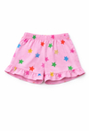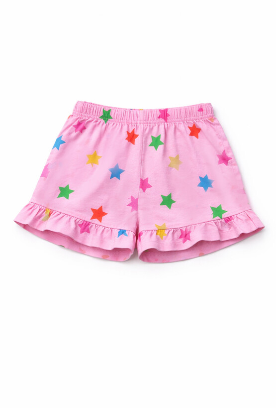 Letnie, wygodne i pełne koloru! Różowe szorty 1/2 z 100% bawełny to świetny wybór na ciepłe dni. Elastyczna gumka w pasie zapewnia komfort i łatwe zakładanie, a delikatny nadruk w kolorowe gwiazdki dodaje dziewczęcego uroku. Całość dopełnia falbanka z materiału głównego przy nogawkach — idealna do wakacyjnych stylizacji z t-shirtem lub bluzeczką.