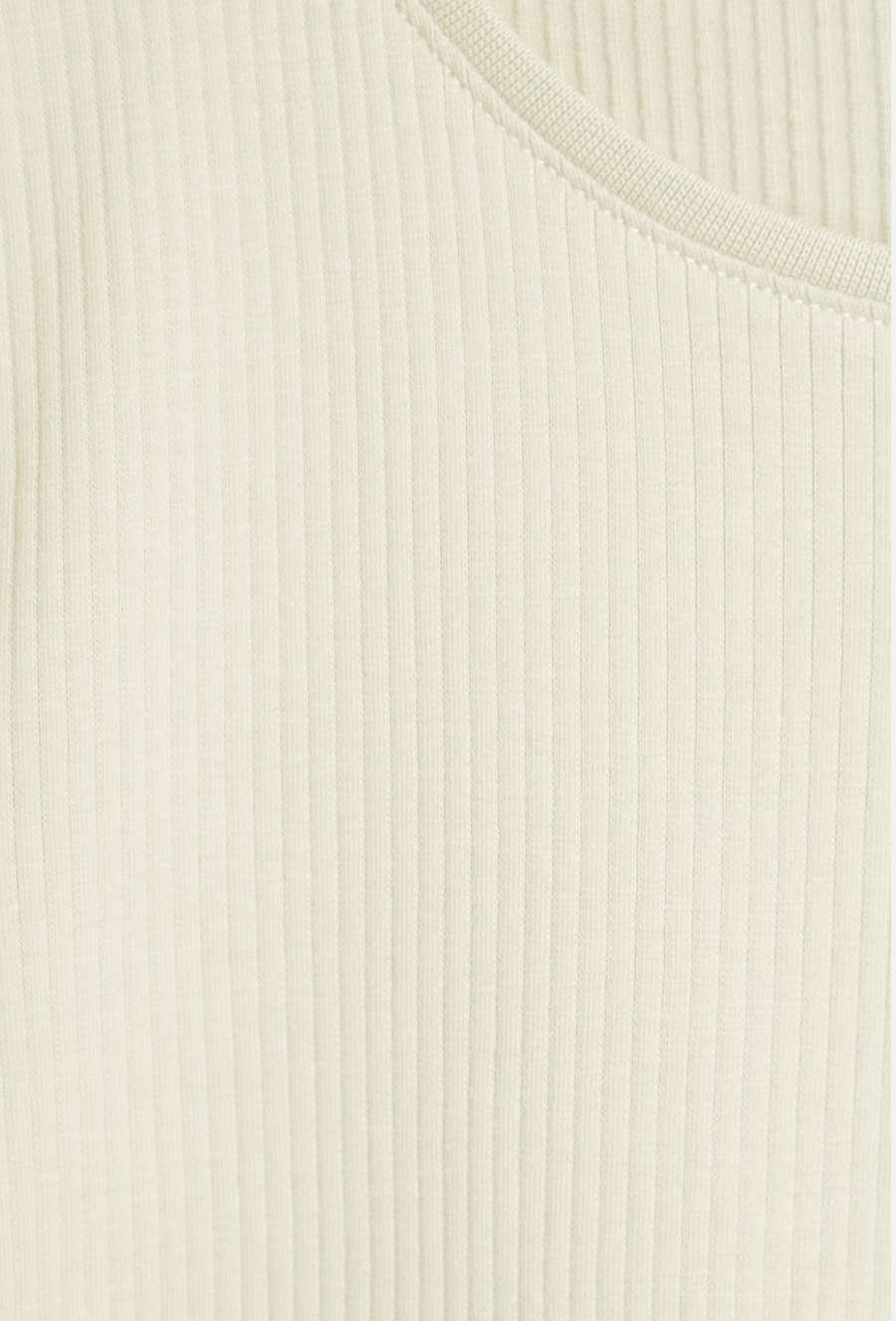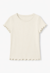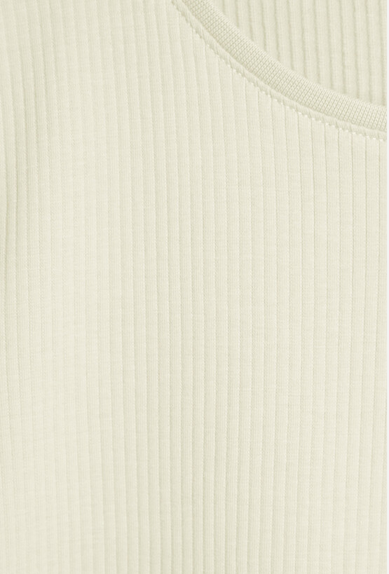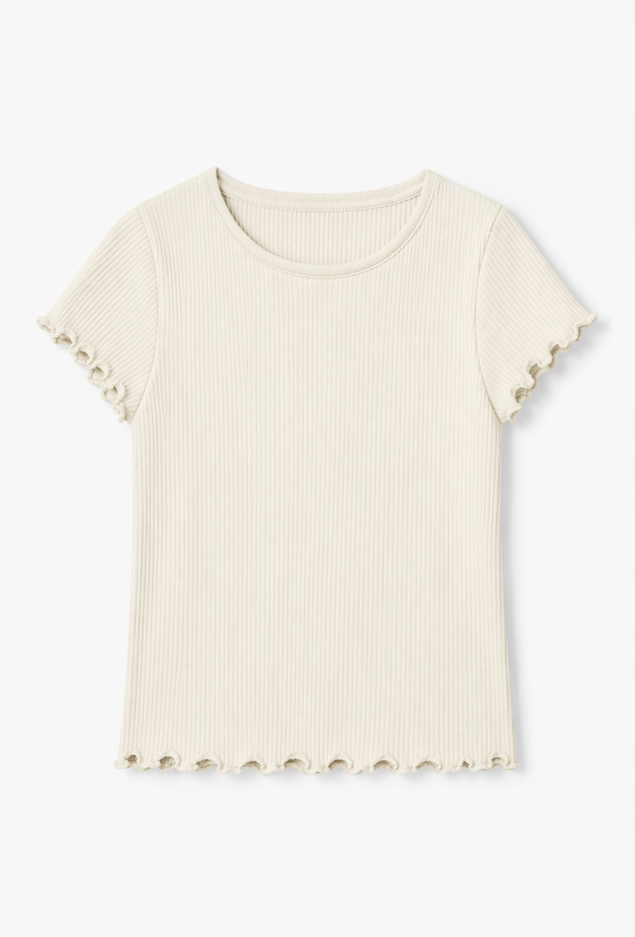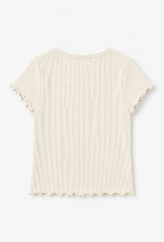 Postaw na ponadczasowy styl i najwyższy komfort! Ta kremowa koszulka to idealna baza do szafy każdej małej dziewczynki. Dzięki swojej delikatnej strukturze i uroczym wykończeniom, T-shirt ten sprawdzi się zarówno jako element codziennego stroju do przedszkola, jak i baza pod elegancką sukienkę czy sweterek. Koszulka została wykonana z prążkowanej dzianiny, która jest niezwykle elastyczna i miękka. Materiał doskonale dopasowuje się do ruchów dziecka, zapewniając swobodę podczas zabawy. Rękawy oraz dół koszulki zostały wykończone dekoracyjnym ściegiem, który tworzy subtelne, dziewczęce falbanki. To detal, który nadaje prostej koszulce unikalnego uroku.