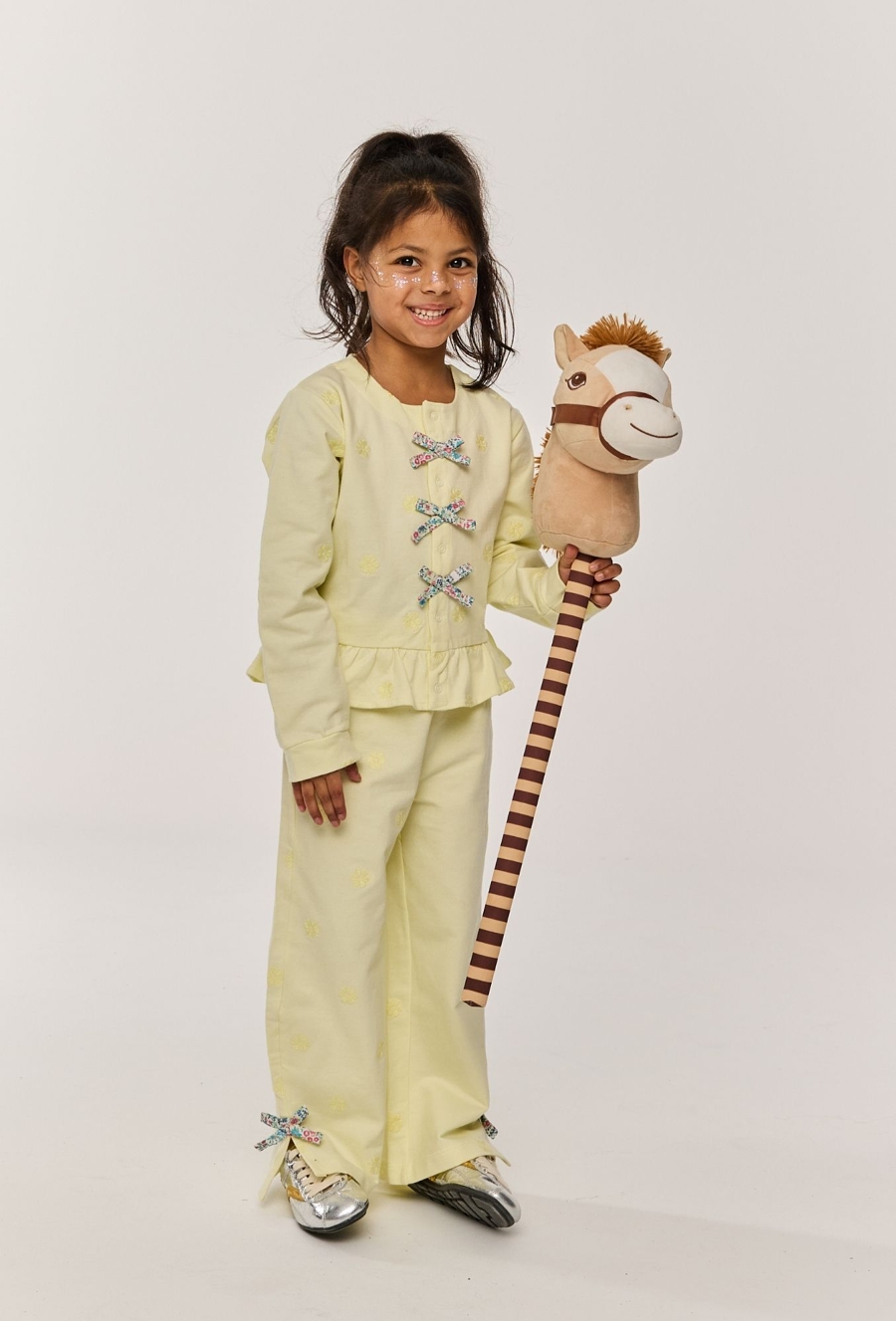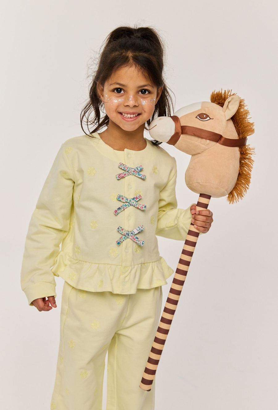 Uroczy żółty żakiet rozpinany to stylowa i wygodna propozycja na co dzień oraz na rodzinne wyjścia. Wykonany w 100% z bawełny z miękkim podbiciem pętelkowym, zapewnia komfort noszenia i przyjemne otulenie w chłodniejsze dni. Całość zdobi delikatny haft w kwiatki rozmieszczony na całej powierzchni, a dodatkowego uroku dodają dekoracyjne kokardki przy zapięciu. Model zapinany jest na praktyczne napy, dzięki czemu dziecko łatwo poradzi sobie z zakładaniem. Dół wykończono efektowną falbaną z materiału głównego, która pięknie układa się w ruchu i nadaje stylizacji lekkości.