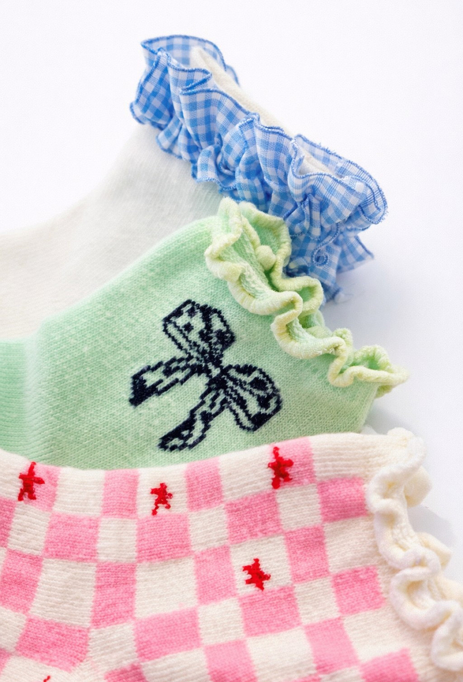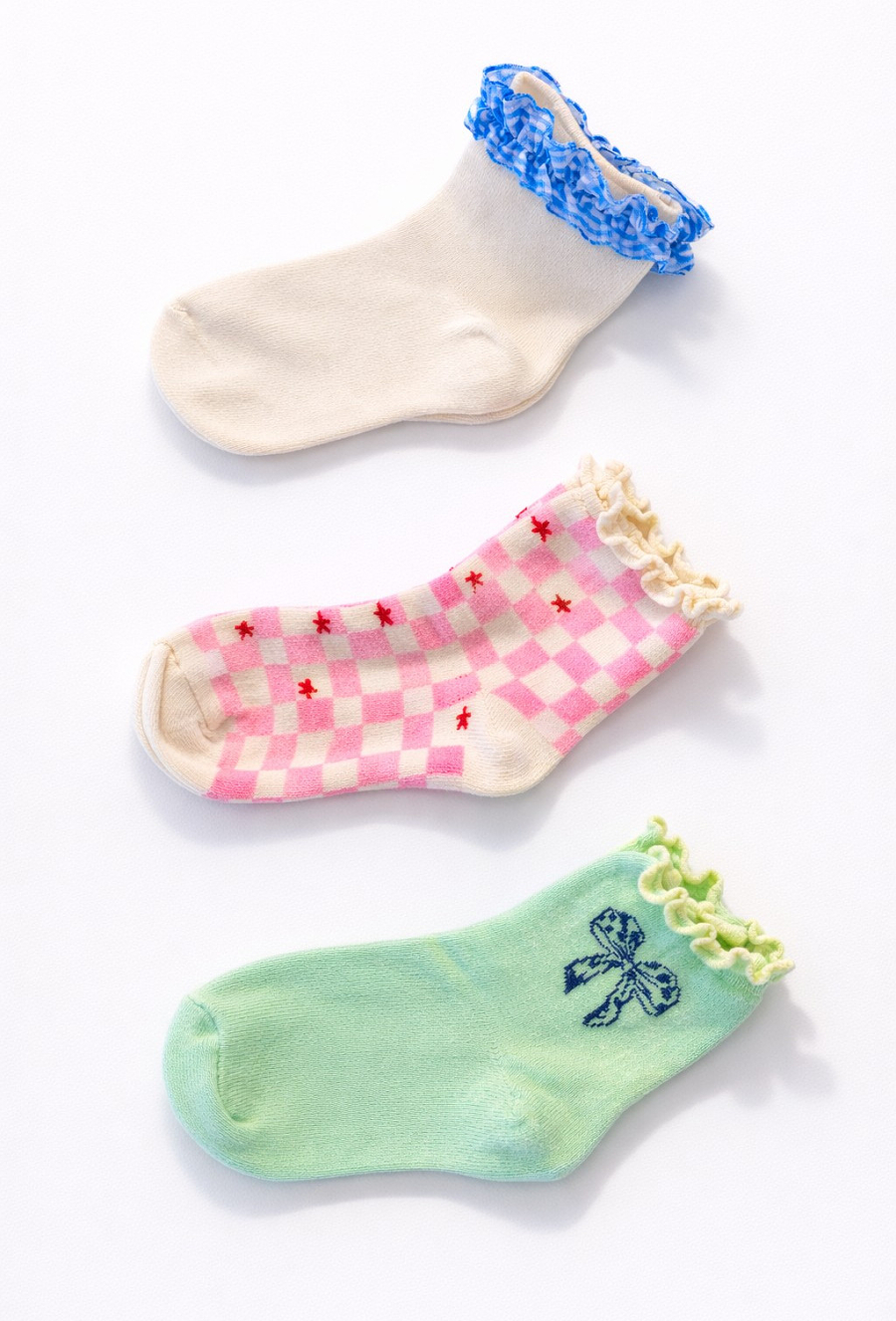 Dziewczęcy zestaw 3 par skarpetek z falbanką to uroczy dodatek, który pięknie wykańcza stylizacje – szczególnie do sukienek, spódniczek i sneakersów. Każda para ma inny charakter: gładka z niebieską falbanką w kratkę, różowa kratka z drobnymi akcentami oraz miętowa z motywem kokardki i delikatnym, falowanym brzegiem. Miękki, przyjemny materiał i klasyczna wysokość sprawiają, że skarpetki świetnie sprawdzą się na co dzień – do przedszkola, na spacer i rodzinne wyjścia.