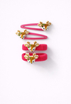 Uroczy komplet, który doda fryzurze bajkowego akcentu! Zestaw ozdób do włosów dla małej dziewczynki składa się z 4 elementów: 2 spinek typu klik-klak oraz 2 gumek w intensywnym różowym kolorze. Każdy element ozdobiony jest dekoracją z motywem jelonka, dzięki czemu zestaw pięknie pasuje do codziennych i odświętnych stylizacji.