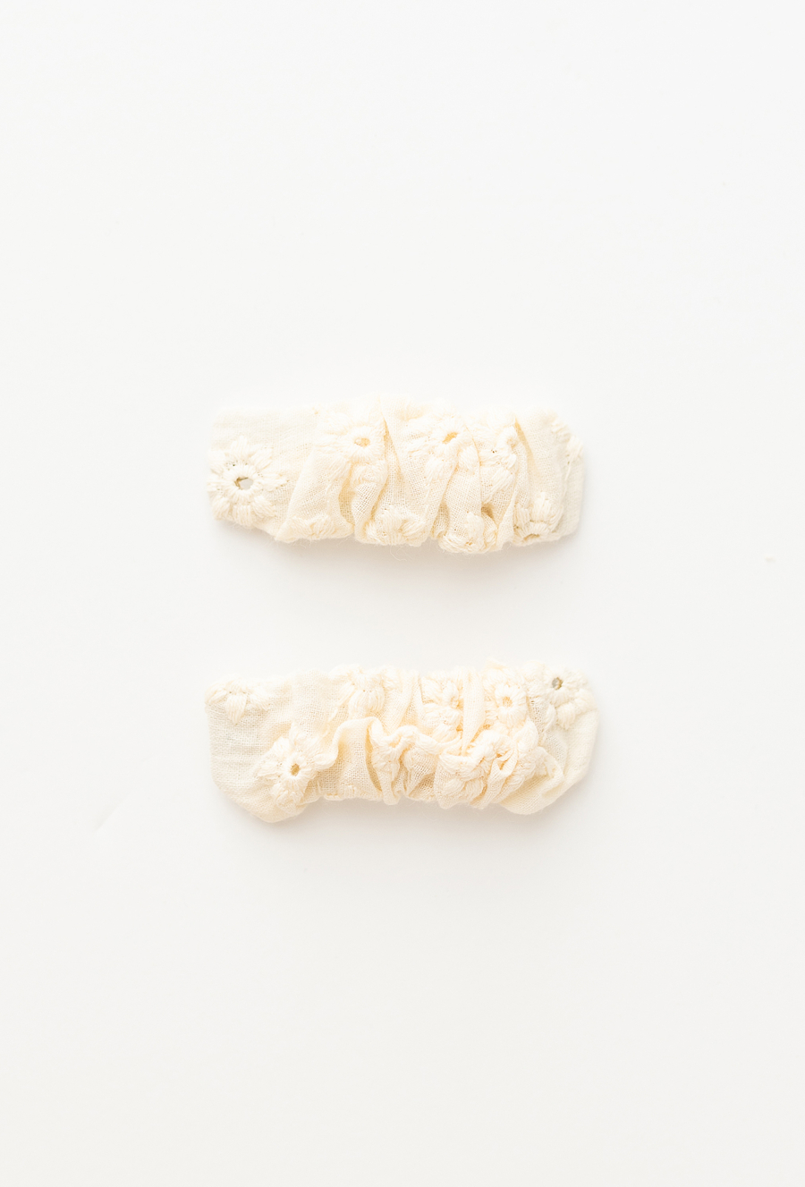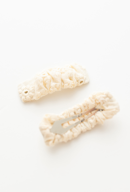 Zestaw dwóch kremowych spinek do włosów to idealny dodatek do dziewczęcych fryzur – zarówno na co dzień, jak i na wyjątkowe okazje. Spinki mają miękkie, koronkowe wykończenie z subtelnymi zdobieniami kwiatków. Dzięki wygodnemu zapięciu łatwo utrzymują włosy na miejscu, nie ciągną i nie wyrywają pasm. To praktyczny i stylowy dodatek, który pokocha każda mała miłośniczka pięknych akcesoriów.