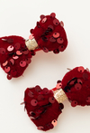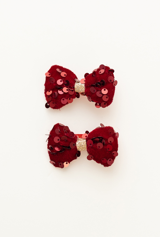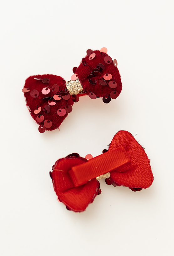 Dodaj świątecznego blasku do stylizacji Twojej małej modnisi z tym uroczym zestawem spinek! W komplecie znajdują się dwie kokardki wykonane z miękkiego, czerwonego weluru, ozdobione błyszczącymi cekinami i złotym środkiem, który dodaje elegancji. Dzięki wsuwkom typu klips, spinki łatwo i bezpiecznie utrzymują się we włosach. Idealne na święta, sesje zdjęciowe czy specjalne okazje!.