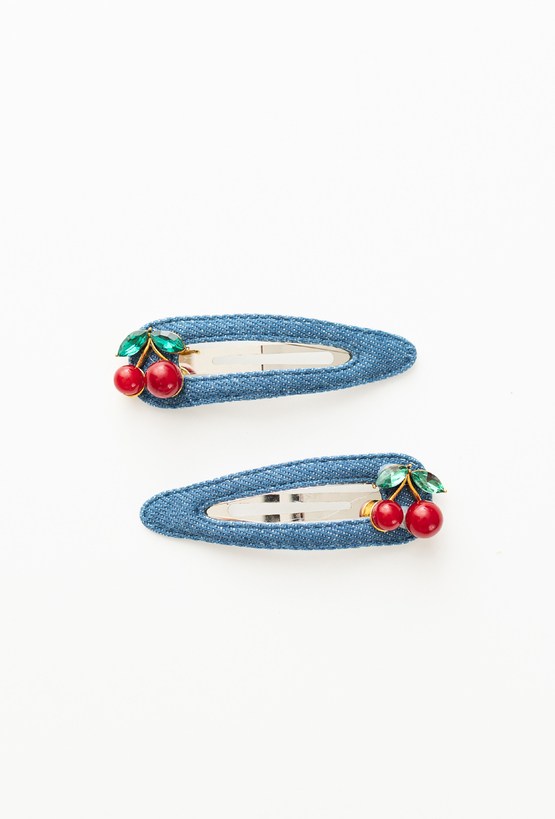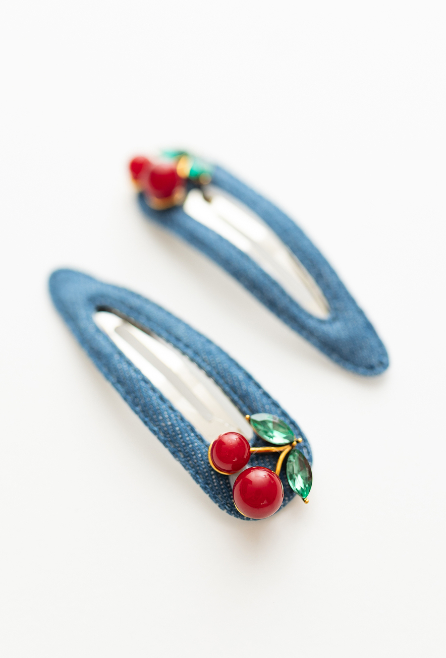 Zestaw dwóch spinek do włosów dla dziewczynki w modnym denimowym wykończeniu, ozdobionych uroczym motywem czerwonych wiśni i zielonych listków. Spinki są lekkie, wygodne i delikatne dla włosów, dzięki czemu idealnie sprawdzą się zarówno na co dzień, jak i na specjalne okazje. Stylowy dodatek, który pięknie uzupełni fryzurę i doda dziewczęcego uroku.
