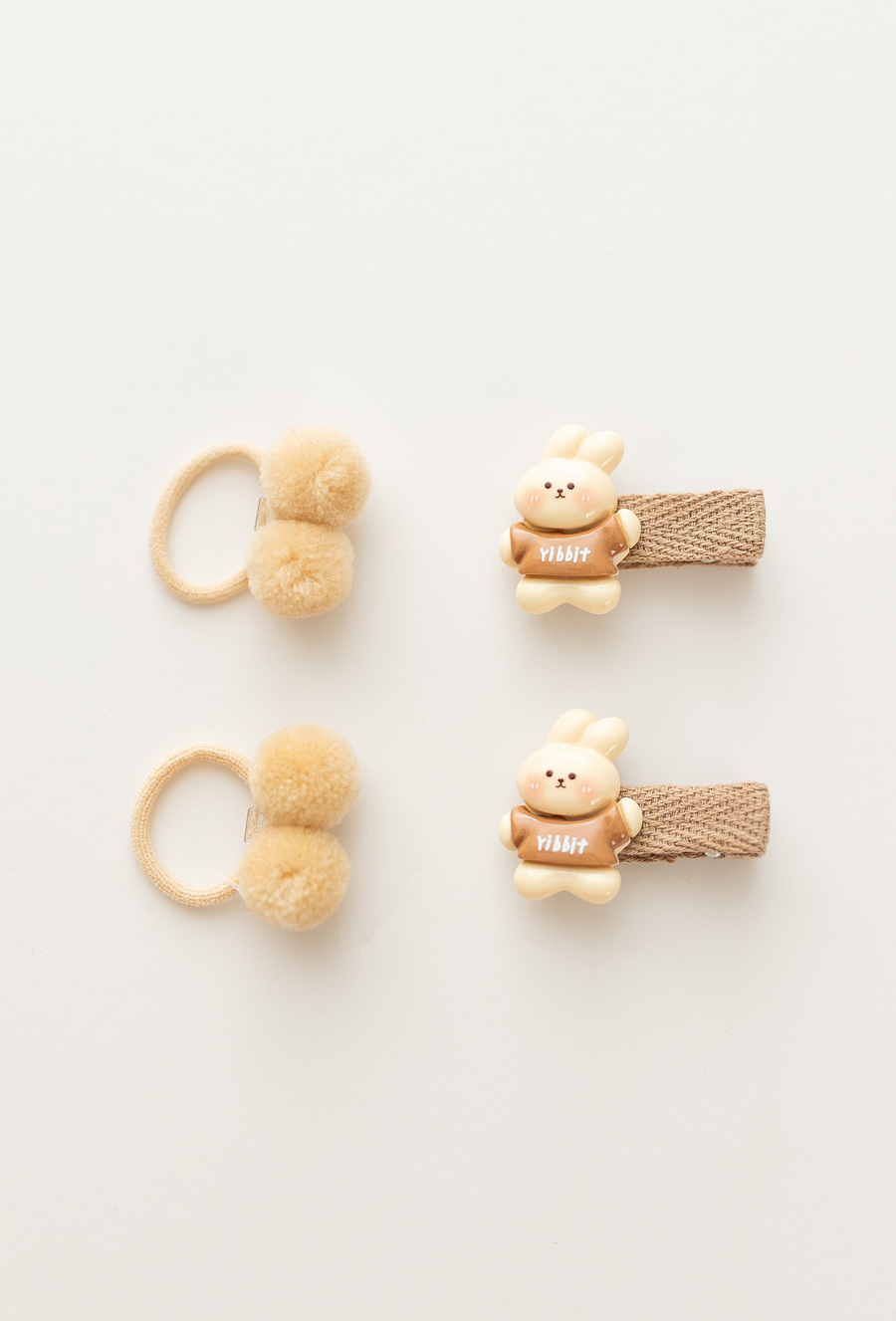 Uroczy zestaw ozdób do włosów dla dziewczynki składający się z dwóch spinek z króliczkiem i dwóch gumek z miękkimi pomponami. Utrzymany w ciepłych, beżowych tonacjach – doskonały do codziennych stylizacji i wyjątkowych okazji. Spinki dobrze trzymają się włosów, a gumki są elastyczne i delikatne dla dziecięcych włosów.