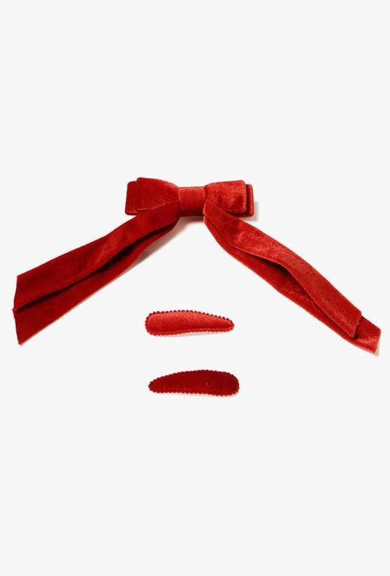 Zestaw spinek idealny do bożonarodzeniowych stylizacji. W komplecie znajduje się welurowa kokarda w głębokiej czerwieni oraz dwie klasyczne spinki obleczone miękkim materiałem w tym samym odcieniu. Welurowa kokarda doda każdej stylizacji elegancji i świątecznego charakteru. Mniejsze spinki świetnie sprawdzą się do podpinania kosmyków lub jako subtelne uzupełnienie fryzury.
