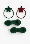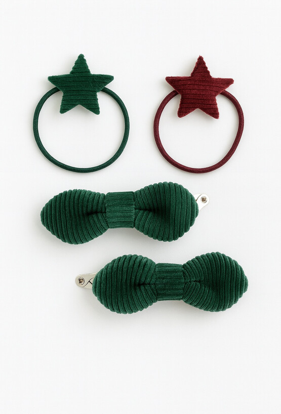 Zestaw akcesoriów do włosów to urocze dopełnienie każdej zimowej stylizacji. W komplecie znajdują się dwie gumki z materiałowymi gwiazdkami w kolorze czerwonym i zielonym oraz dwie spinki ozdobione eleganckimi kokardkami z prążkowanego materiału. Miękkie tkaniny i delikatne mocowania są bezpieczne dla dziecięcych włosów. Zestaw sprawdzi się doskonale podczas świątecznych uroczystości, przedszkolnych występów i rodzinnych spotkań.