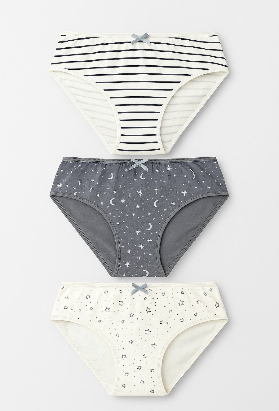 Uroczy 3-pak majtek dla dziewczynki z miękkiej bawełny. W komplecie znajdują się trzy pary w dziewczęcych wzorach: paski, gwiazdki i księżyce. Klasyczny krój oraz elastyczna gumka w pasie zapewniają wygodę i dobre dopasowanie przez cały dzień.