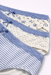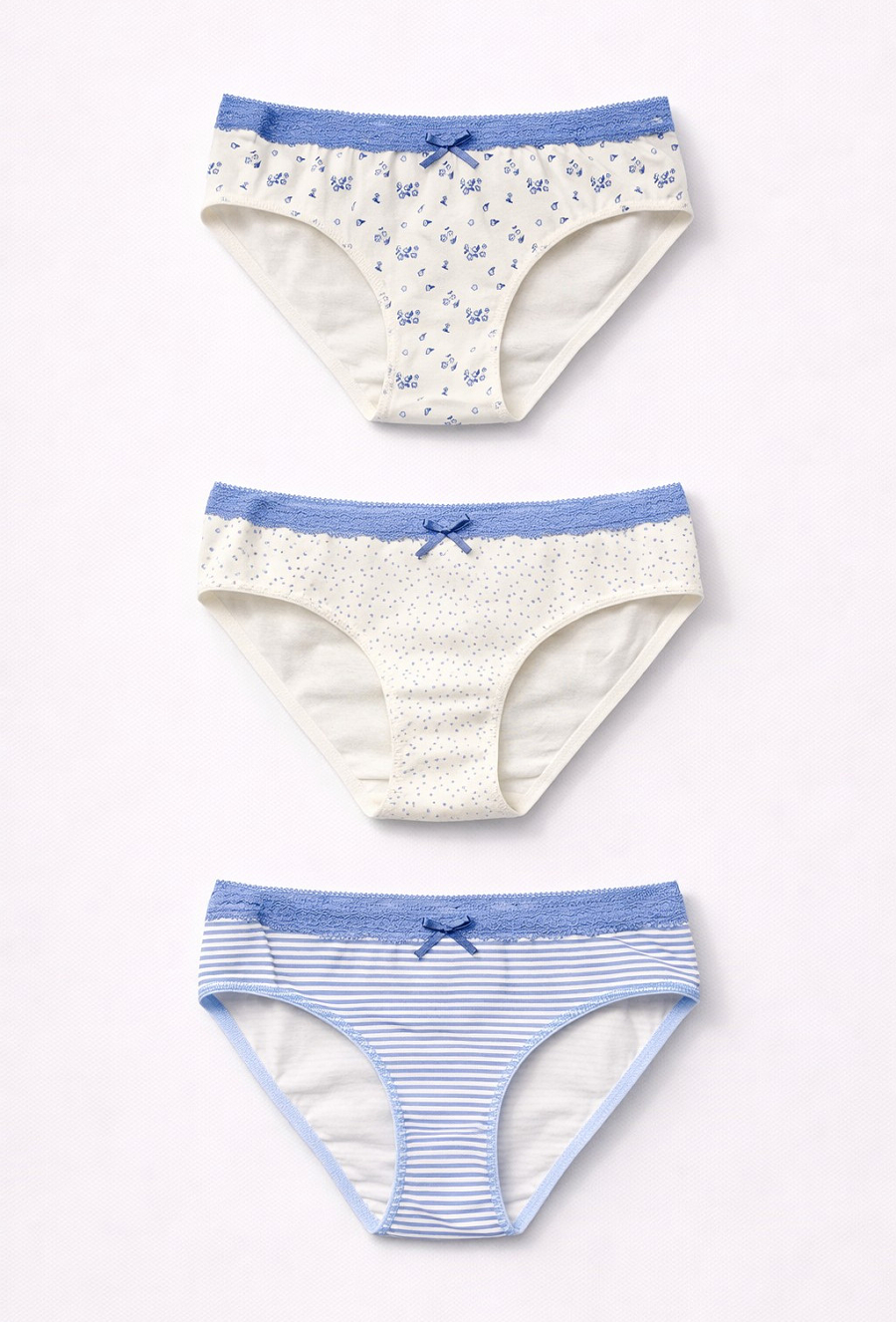 3-pak majtek dziewczęcych bawełnianych to wygodny zestaw bielizny na co dzień, który łączy komfort noszenia z delikatnym, dziewczęcym wykończeniem. W komplecie znajdują się trzy pary: model z drobnym kwiatowym printem, model w subtelne kropki oraz model w niebiesko-białe paski. Miękka bawełna zapewnia wygodę przez cały dzień – w szkole, przedszkolu i podczas zabawy. Klasyczny krój dobrze dopasowuje się do sylwetki dziecka, a elastyczne wykończenia pomagają utrzymać komfort bez nadmiernego ucisku. Ozdobna niebieska koronka w pasie i małe kokardki dodają całości subtelnego uroku.