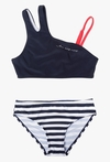 Przygotuj się na wakacyjne szaleństwo w najlepszym stylu! Ten dwuczęściowy strój kąpielowy to idealne połączenie nowoczesnego kroju z ponadczasowym marynarskim motywem. Zaprojektowany z myślą o aktywnych dziewczętach, zapewnia pełną swobodę ruchów podczas pływania, gry w siatkówkę plażową czy skoków do wody. Top kostiumu wyróżnia się nowoczesnym krojem na jedno ramię. Z jednej strony posiada szeroki pas materiału z modnym wycięciem, a z drugiej dwa cienkie, kontrastowe ramiączka w kolorze intensywnego koralu. To detal, który nadaje całości unikalnego charakteru. Na przodzie umieszczono subtelny, biały napis „Make today happy”, który dodaje strojowi dziewczęcego uroku i pozytywnej energii.