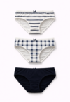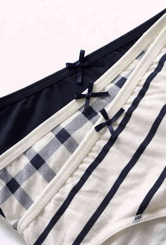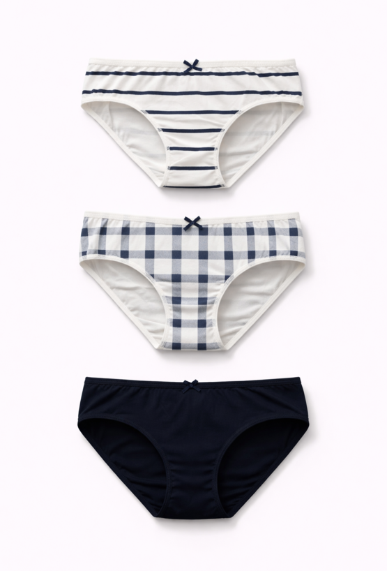 Wygodny komplet w klasycznej, granatowo-białej kolorystyce. Zestaw 3 par majtek dziewczęcych wykonanych z miękkiej dzianiny 95% bawełna, 5% elastan łączy komfort z lepszym dopasowaniem do sylwetki. Każda para ma subtelną kokardkę z przodu, a w komplecie znajdziesz różne wzory: granatowe gładkie, w paski oraz w kratkę.