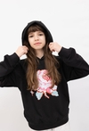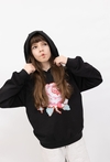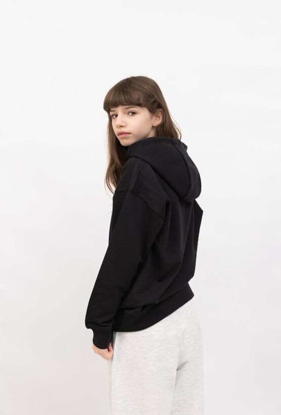 Czarna bluza z kapturem w fasonie oversize to wygodna propozycja na chłodniejsze dni. Model jest ocieplany – od wewnętrznej strony ma przyjemny meszek, który daje dodatkowe ciepło i komfort. Na przodzie znajduje się efektowny nadruk z motywem róży, który nadaje stylizacji charakteru. Bluza świetnie sprawdzi się do jeansów, legginsów i spodni dresowych – na co dzień, do szkoły i na weekend.
