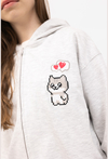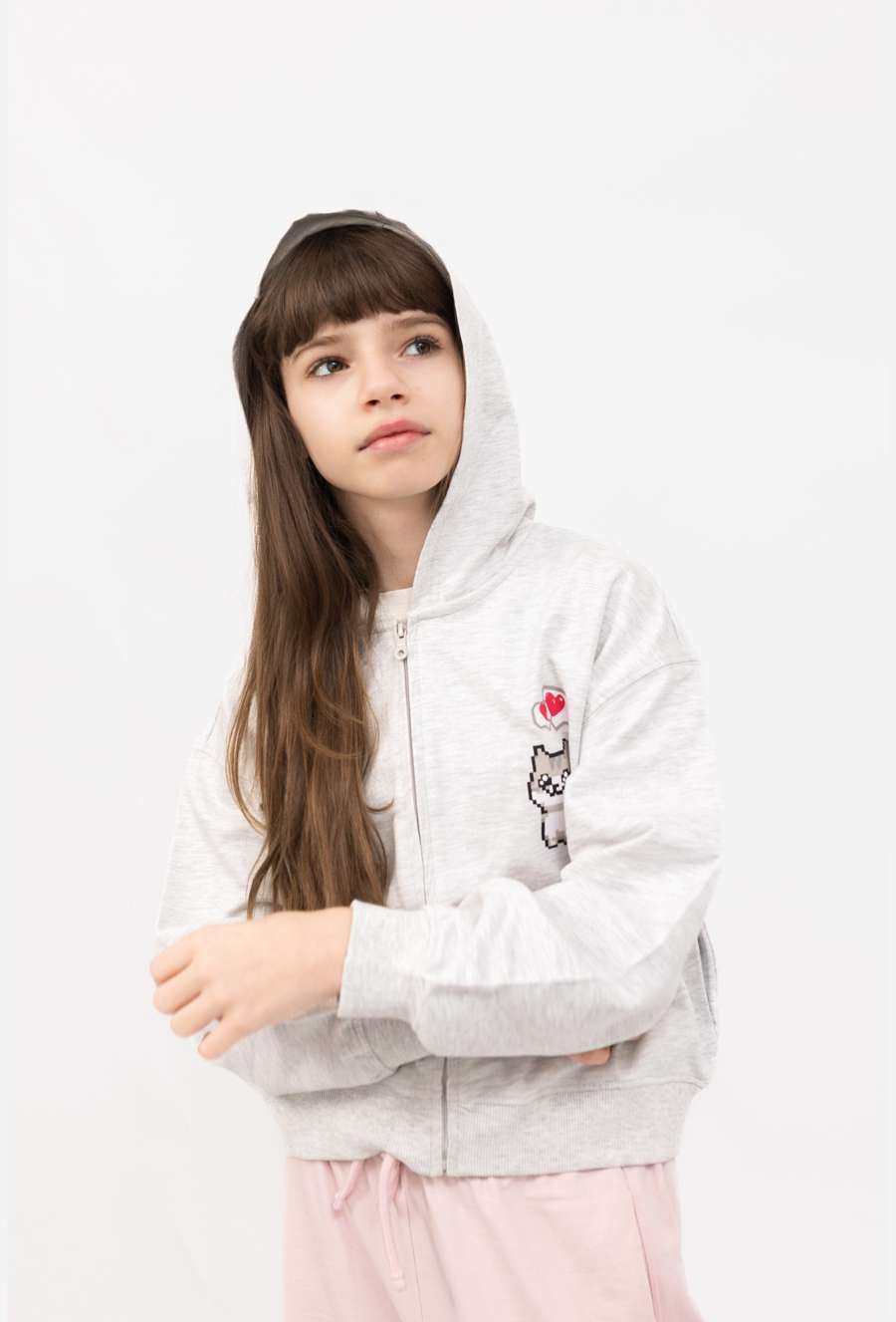 Szara bluza rozpinana z kapturem dla dziewczynki to połączenie wygody i uroczego detalu w stylu pixel. Model ma zapięcie na suwak, dzięki czemu łatwo dopasować ją do pogody i szybko założyć na t-shirt. Luźniejszy fason z opuszczonymi ramionami nadaje nowoczesny, casualowy look, a kieszenie ukryte w bocznych szwach są praktyczne i dyskretne. Na piersi znajduje się nadruk z motywem kota (pixelowy charakter), który dodaje bluzie dziewczęcego uroku.