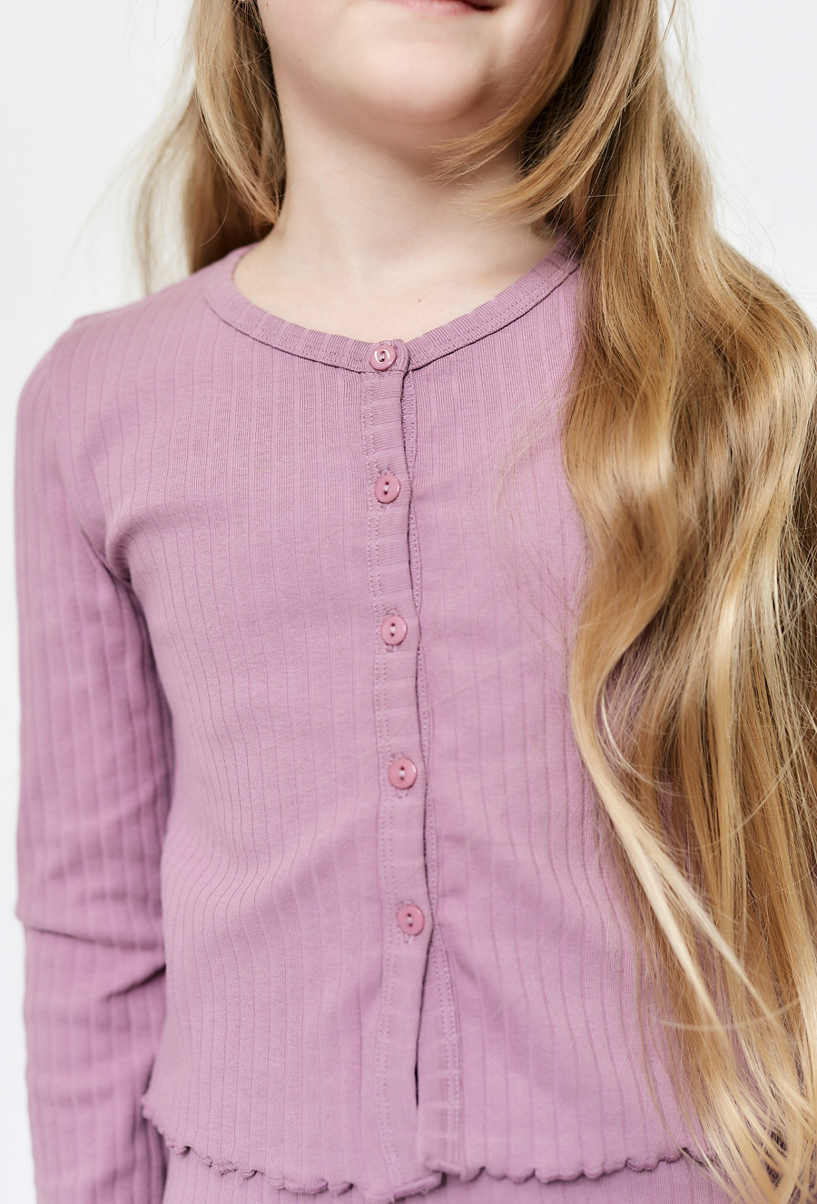Dziewczęca bluzka z długim rękawem w pięknym, lawendowym kolorze. Model zapinany na guziki, wykonany z komfortowej, prążkowanej dzianiny, która doskonale układa się na sylwetce dziecka. Brzegi rękawów oraz dół bluzki wykończone ozdobną falbanką, co dodaje uroku całości. Idealna zarówno na co dzień, jak i na rodzinne spotkania. Świetnie wygląda noszona samodzielnie lub jako lekki kardigan do sukienek czy topów.
