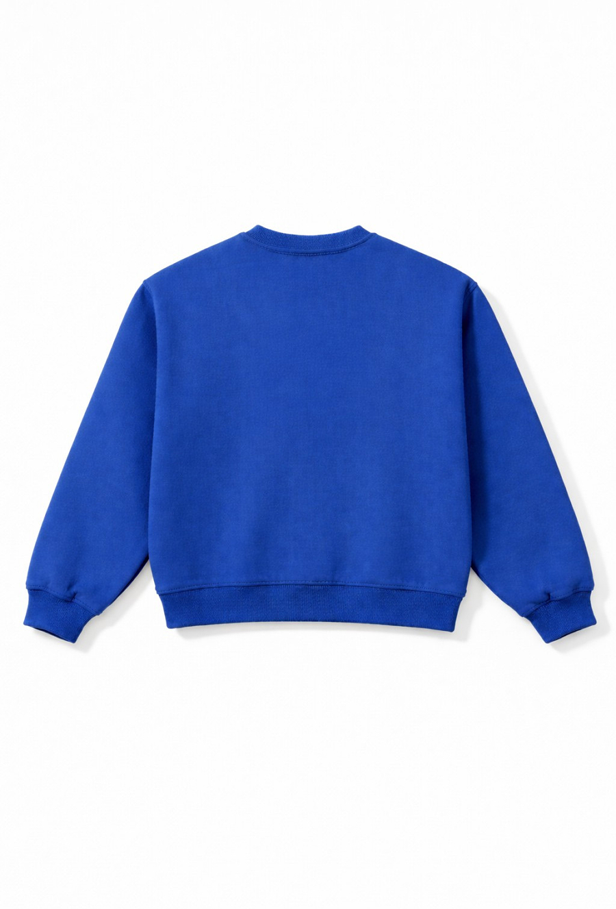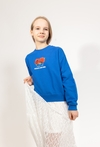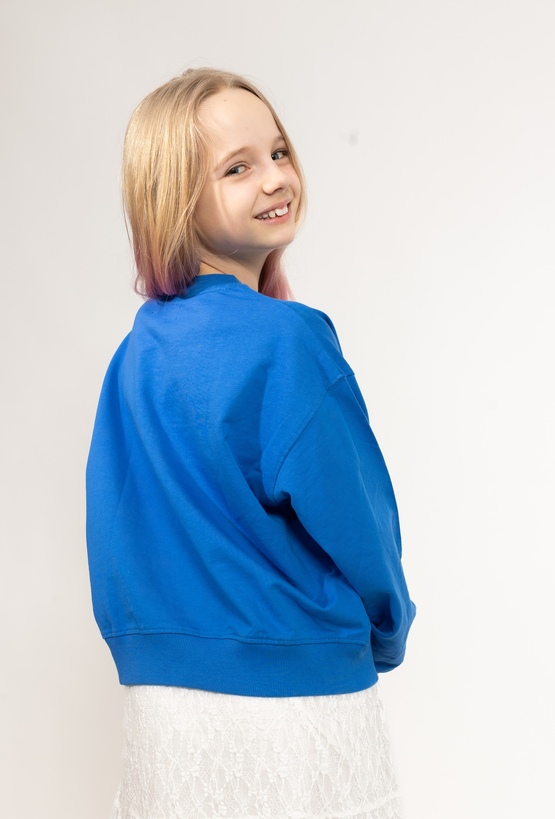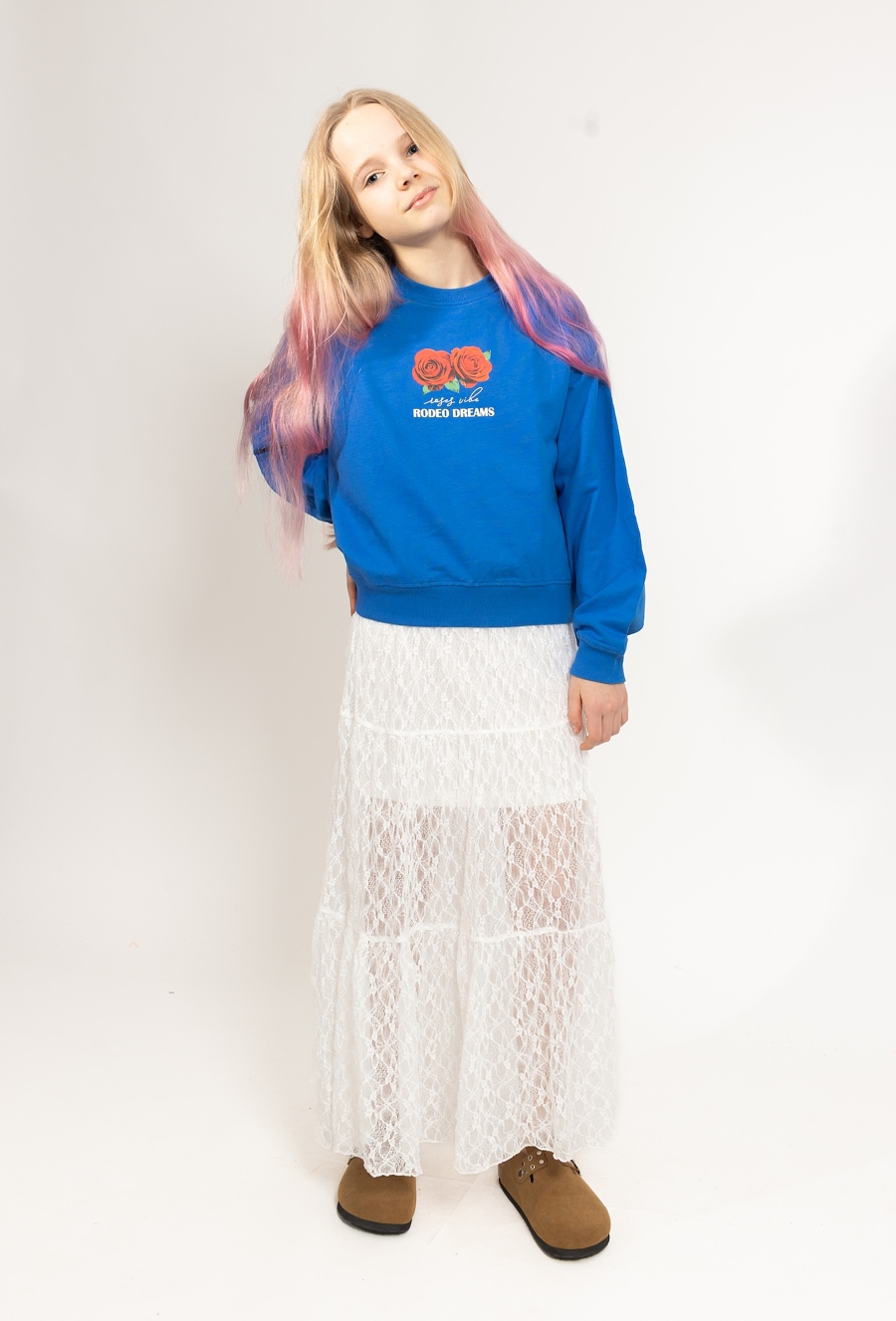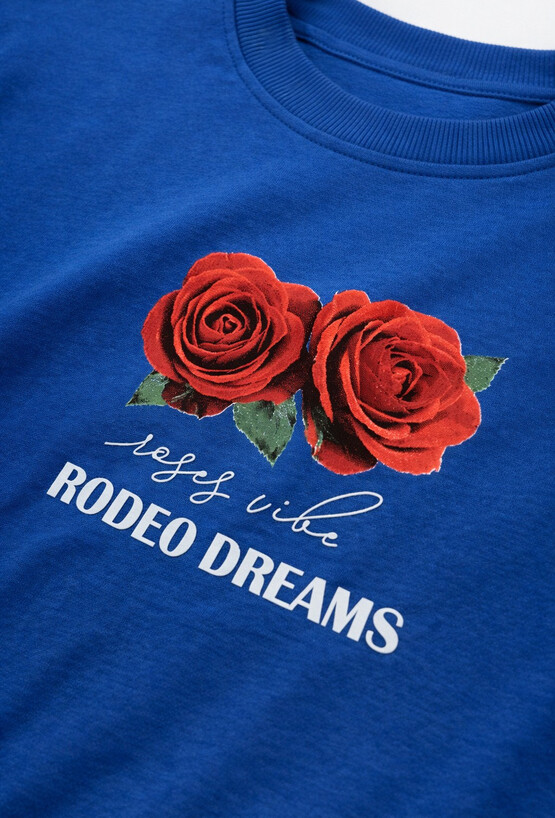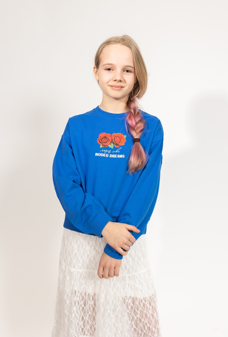 Stylowa niebieska bluza nierozpinana dla dziewczynki to wygodny wybór na co dzień – do szkoły, na spacer i na wyjazdy. Uszyta z 100% bawełny, jest miękka i przyjemna w noszeniu. Fason z opuszczonymi ramionami zapewnia swobodę ruchów i modny, luźniejszy look. Na przodzie znajduje się miękki nadruk z motywem róż i napisem „Rodeo Dreams”, który dodaje charakteru. Dekolt (na stójce), dół bluzy i rękawy wykończono miękkim ściągaczem, dzięki czemu bluza dobrze układa się na sylwetce i trzyma ciepło.