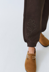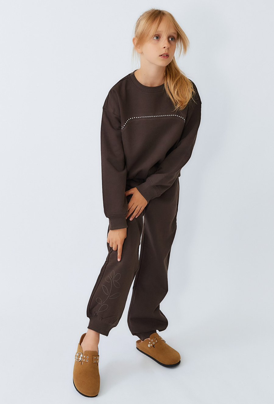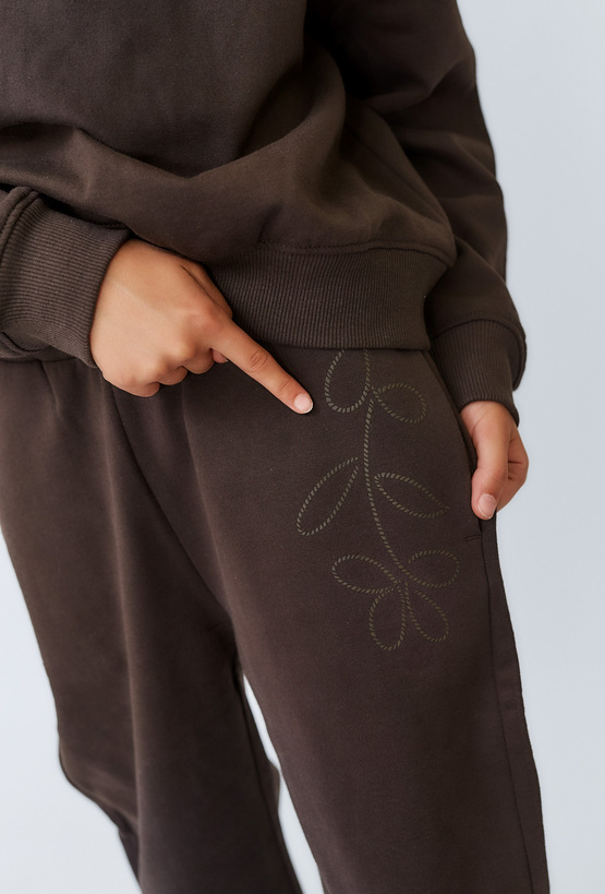 Brązowe spodnie dresowe dziewczęce baggy z wypukłym nadrukiem.