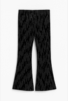 Modne spodnie flare dla dziewczynki wykonane z elastycznej dzianiny o połyskującym wzorze. Krój z rozszerzanymi nogawkami dodaje stylizacji wyjątkowego charakteru. Dzięki miękkiej i elastycznej tkaninie spodnie zapewniają komfort noszenia przez cały dzień. Idealne na święta, uroczystości, rodzinne przyjęcia lub modny codzienny look.