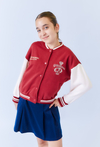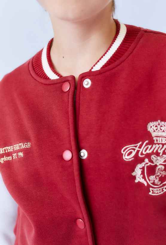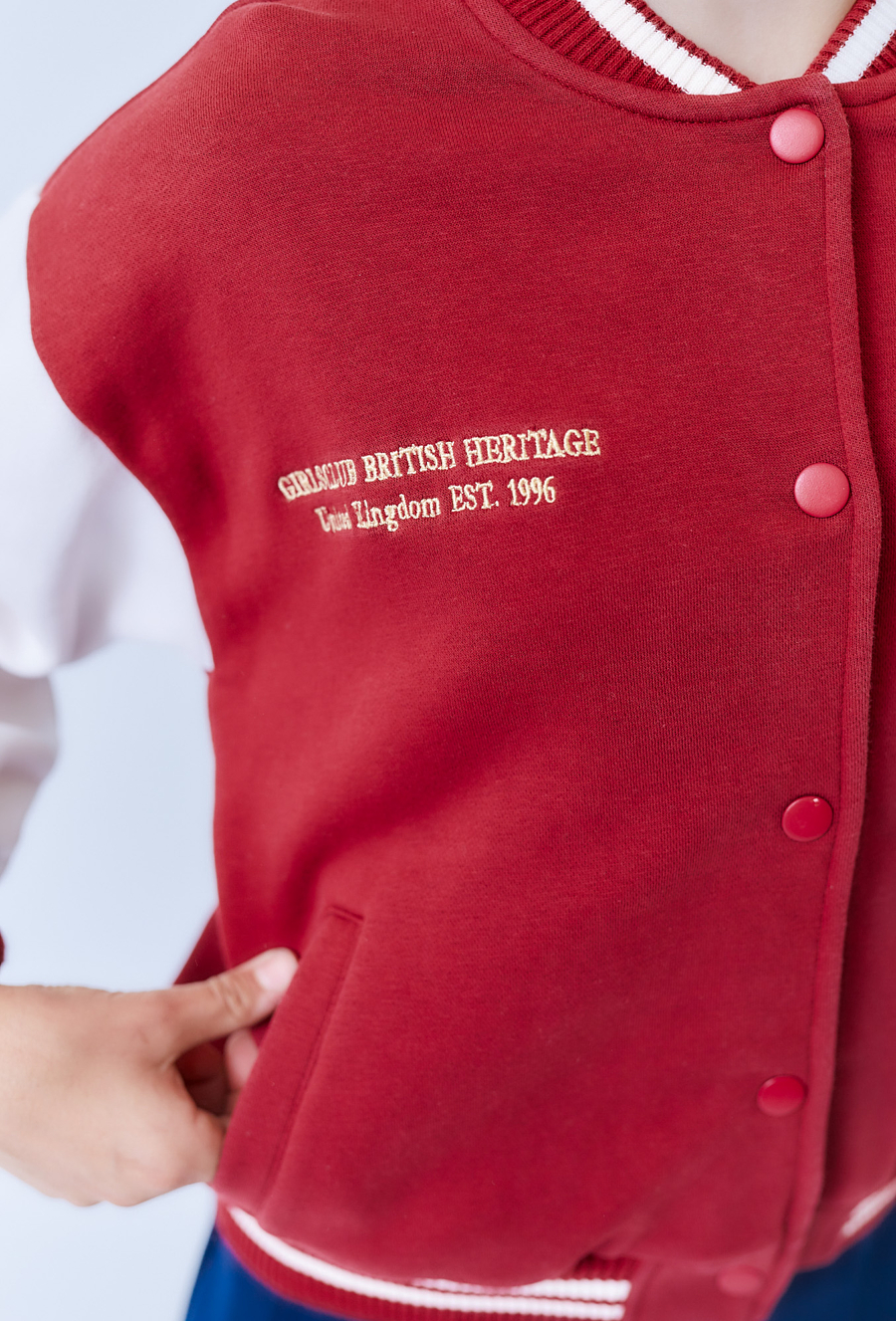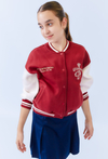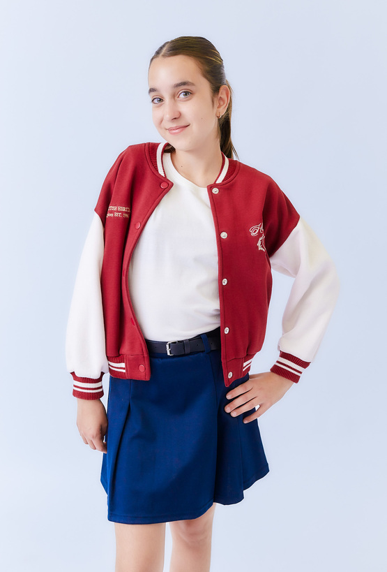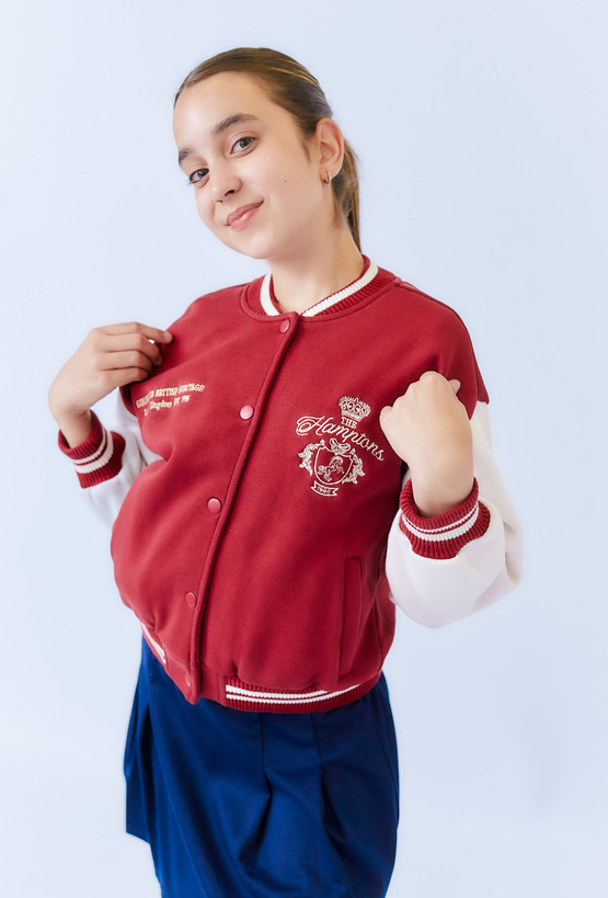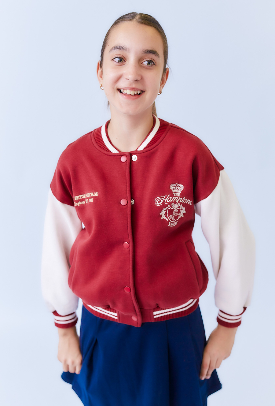 Stylowa bomberka dziewczęca w czerwonym kolorze to idealna propozycja na sezon przejściowy. Model został wykonany z wysokiej jakości mieszanki bawełny i poliestru (65% bawełna, 35% poliester) oraz ocieplony, by zapewnić komfort cieplny w chłodniejsze dni. Charakterystyczne kontrastowe rękawy, ozdobne hafty na przodzie oraz paski w ściągaczach nawiązują do stylu college i dodają kurtce niepowtarzalnego charakteru. Doskonała do szkoły, na co dzień i weekendowe wyjścia – ta bomberka to must-have każdej stylowej dziewczynki.