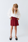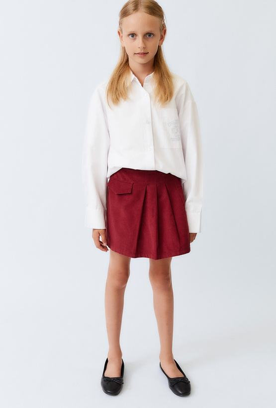 Modna, czerwona spódniczka dziewczęca w całości wykonana z wysokiej jakości bawełny. Sztruksowa tkanina nadaje jej wyjątkowego charakteru, a zakładki z przodu dodają uroku i swobody ruchów. Ozdobna kieszonka na przodzie podkreśla oryginalny styl. Krótki fason świetnie sprawdzi się zarówno w eleganckich, jak i codziennych stylizacjach.