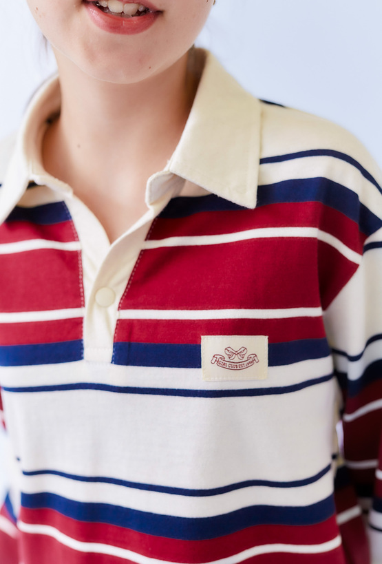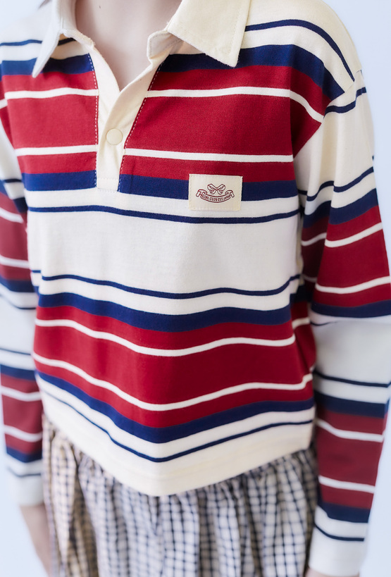 Dziewczęce polo z długim rękawem w czerwono-granatowe paski to stylowy wybór na każdą okazję. Wykonane w 100% z miękkiej bawełny, zapewnia komfort noszenia przez cały dzień. Model posiada klasyczny kołnierzyk, ozdobną naszywkę oraz ponadczasowy wzór w paski. Świetnie komponuje się zarówno z jeansami, jak i spódniczkami, tworząc modne stylizacje na co dzień i do szkoły.