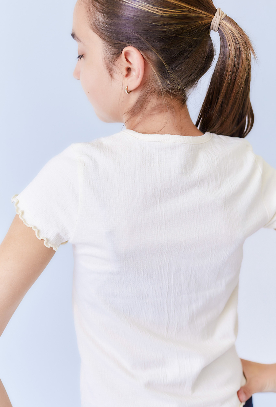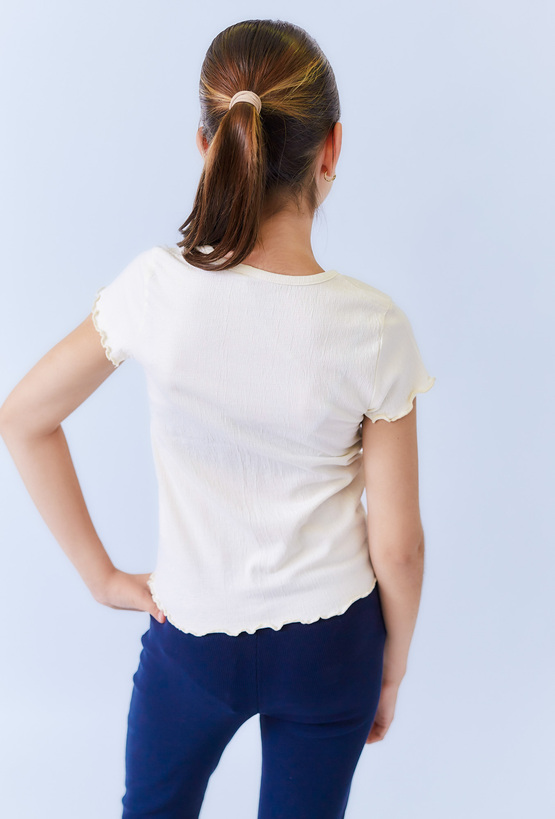 Delikatna bluzka dziewczęca z krótkim rękawem wykonana z miękkiej, przyjemnej w dotyku tkaniny. Subtelne detale, takie jak falowany brzeg rękawów i dołu, nadają jej dziewczęcego uroku, a prosty krój sprawia, że świetnie pasuje zarówno do jeansów, jak i eleganckich spodni czy spódniczki. To uniwersalna baza wielu stylizacji – idealna do szkoły, na spacer lub rodzinne spotkania.