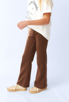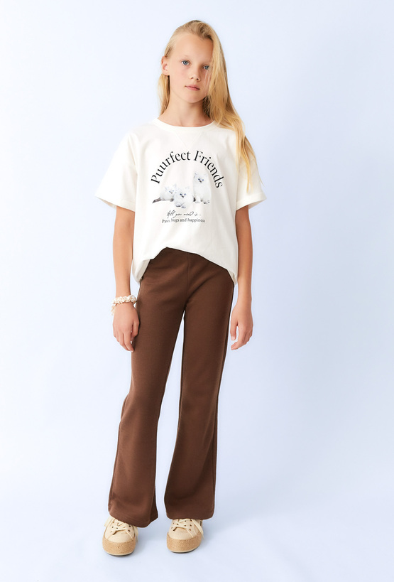 Stylowe spodnie typu flare dla dziewczynki w głębokim odcieniu brązu. Wykonane z przyjemnej w dotyku dzianiny, zapewniają wygodę i swobodę ruchów przez cały dzień. Rozszerzane nogawki to modny akcent, który świetnie prezentuje się zarówno z t-shirtem, jak i swetrem. Idealne na co dzień, do szkoły czy spotkania z przyjaciółmi.