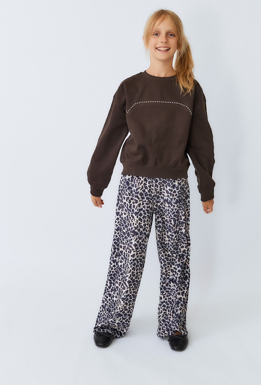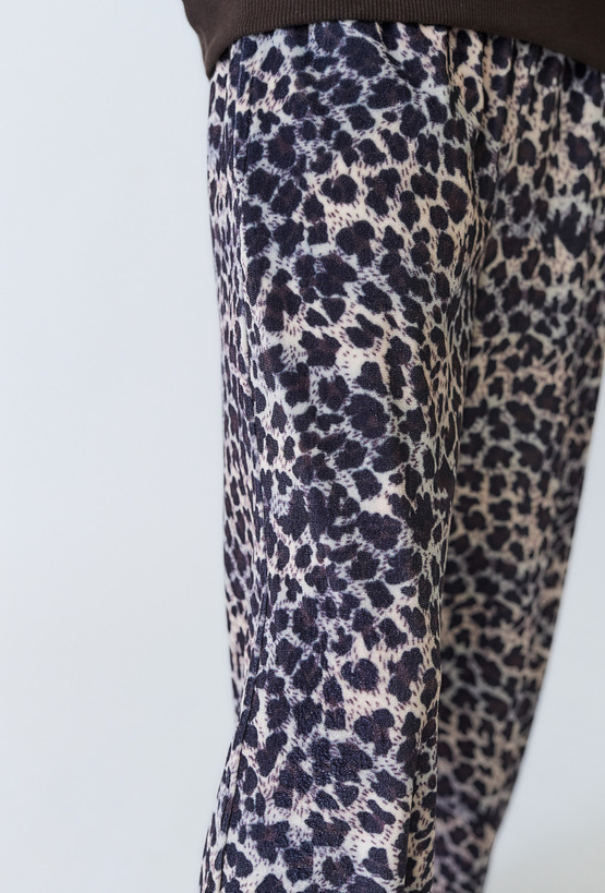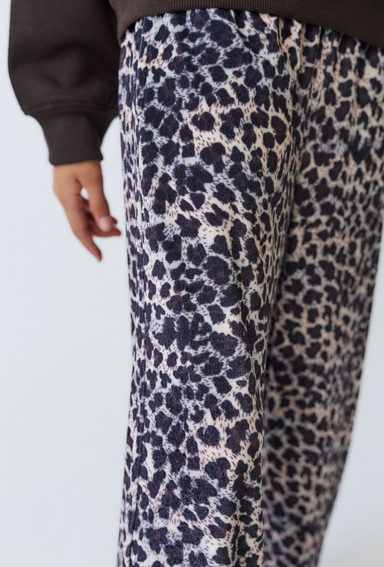 Dziewczęce spodnie w panterkę z szeroką nogawką.