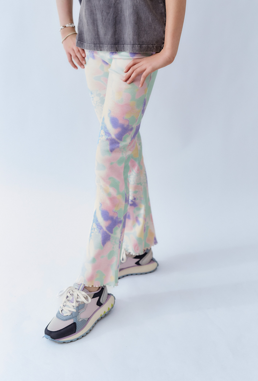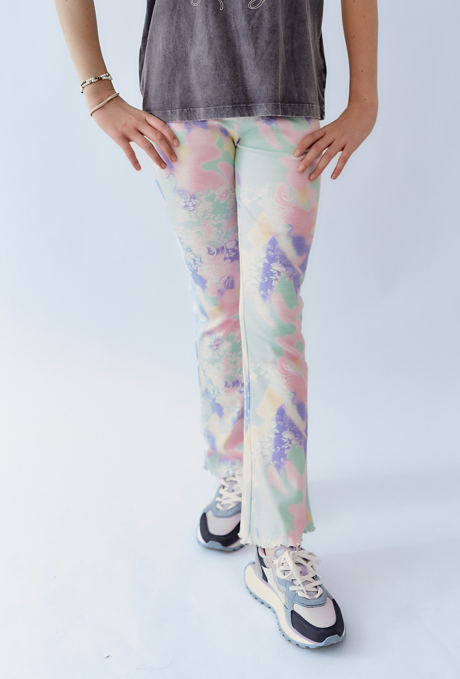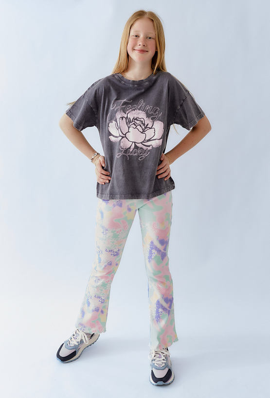 Dziewczęce legginsy z rozszerzanymi nogawkami, pokryte abstrakcyjnym nadrukiem w pastelowych kolorach. Elastyczny pas i miękki materiał zapewniają wygodę noszenia, a nietypowy wzór wyróżnia się w każdej stylizacji. Świetny wybór dla dziewczynki, która lubi wygodę i wyraziste detale.