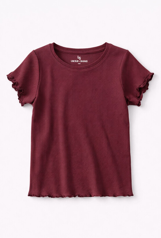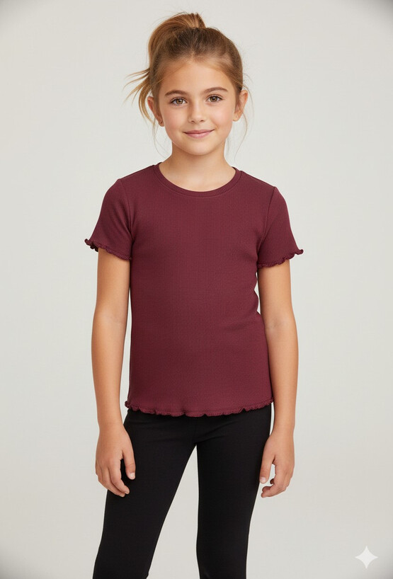 Stylowa i wygodna koszulka dla dziewczynki to doskonała baza do codziennych stylizacji. Zapewnia komfort noszenia oraz jest przyjemna w dotyku i delikatna dla skóry. Dodatek elastanu sprawia, że koszulka jest lekko elastyczna. Klasyczny krój z krótkim rękawem został urozmaicony subtelnym falowanym wykończeniem przy rękawkach i u dołu, co nadaje całości dziewczęcego charakteru.