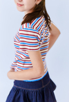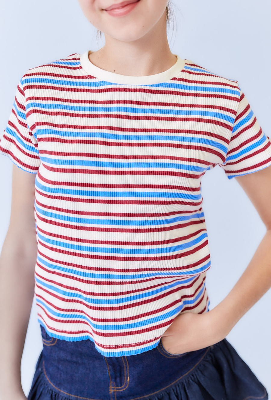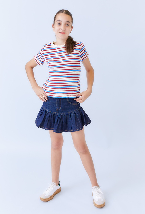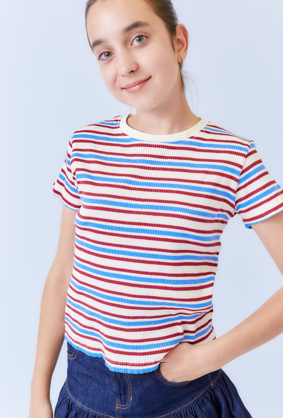 Ta koszulka dziewczęca w paski to klasyka w nowoczesnym wydaniu. Wykonana z przyjemnej w dotyku dzianiny z przewagą bawełny i dodatkiem elastanu, gwarantuje idealne dopasowanie i komfort noszenia. Wzór w kolorowe paski nadaje jej lekkości i letniego charakteru. Idealna do jeansów, spódniczek czy legginsów – sprawdzi się na każdą okazję.