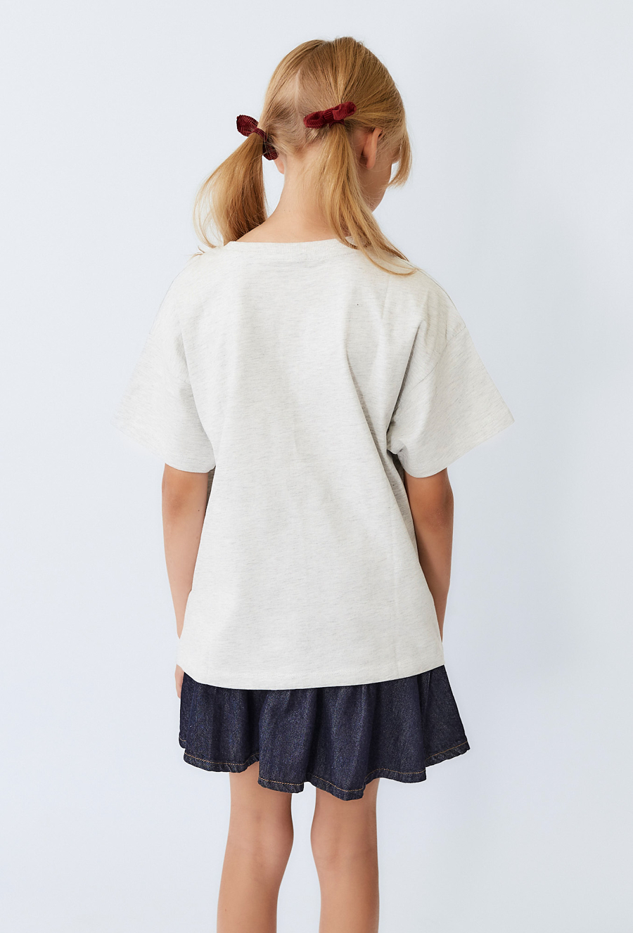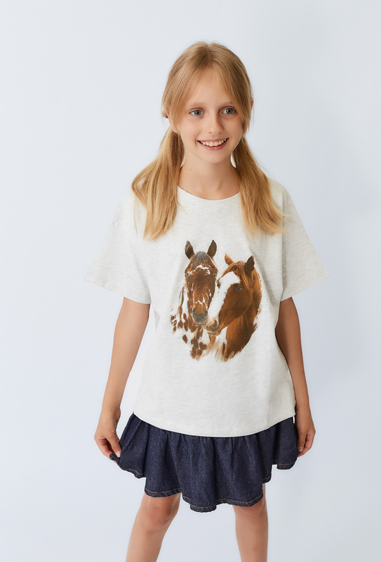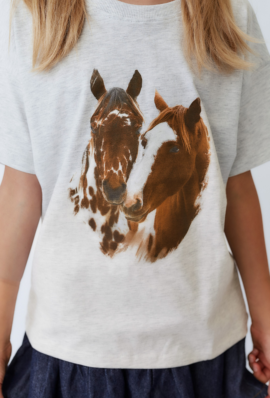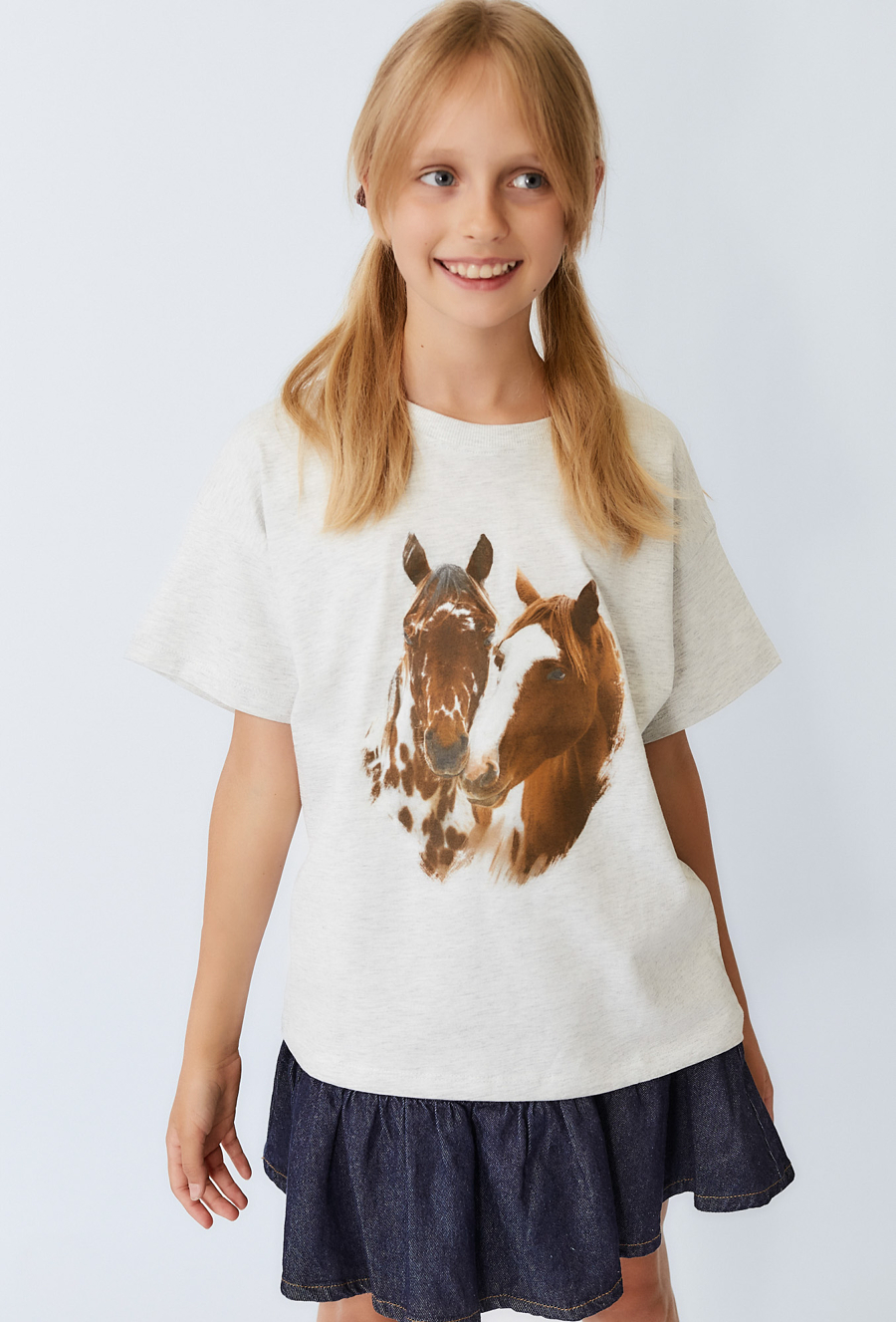 Koszulka dziewczęca szara oversize z fotonadrukiem koni.