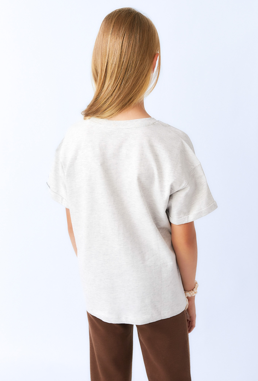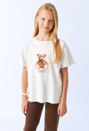 Miękka i przytulna koszulka dziewczęca z misiem. Wykonana z wysokiej jakości dzianiny z przewagą bawełny i dodatkiem wiskozy, co sprawia, że jest delikatna w dotyku i przyjazna dla skóry dziecka. Na froncie znajduje się nadruk pluszowego misia oraz tekst: "A real friend – Every story needs their little hero",co czyni tę koszulkę idealnym wyborem dla każdej dziewczynki, która uwielbia pluszaki. Dzięki klasycznemu fasonowi świetnie komponuje się z legginsami, jeansami czy spódniczką – zarówno do szkoły, jak i na spotkania z przyjaciółmi.