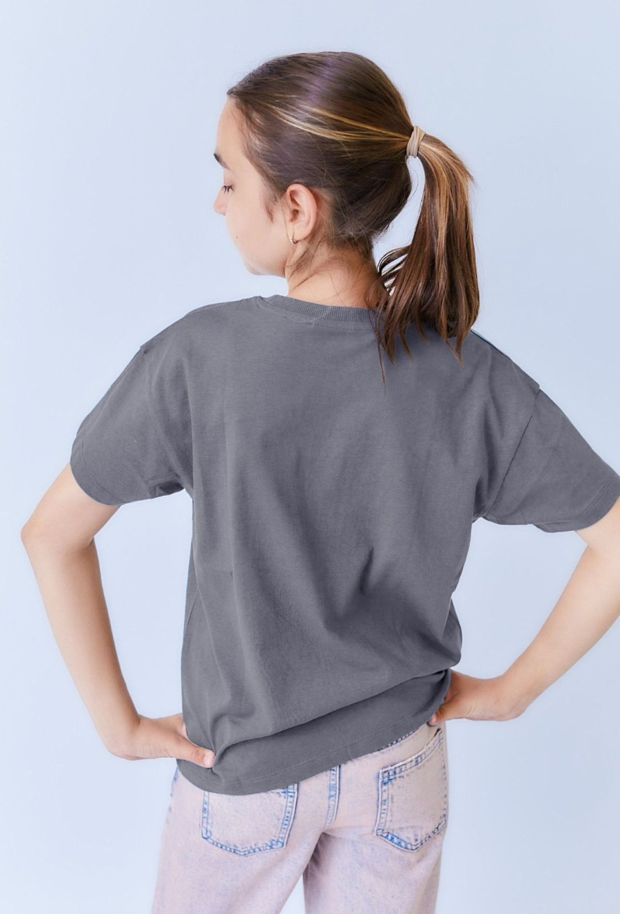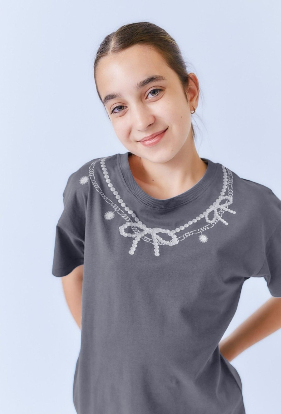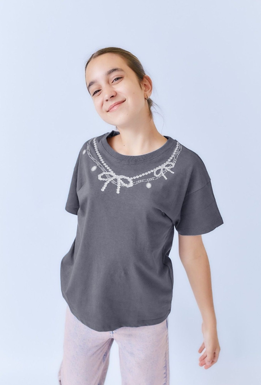 Luźna, niebieska koszulka dla dziewczynki z nadrukiem imitującym koralikowy naszyjnik z kokardkami i zawieszkami. Okrągły dekolt i prosty krój zapewniają swobodę ruchu i wygodę noszenia. Subtelny, a jednocześnie dekoracyjny motyw sprawia, że T-shirt wyróżnia się wśród codziennych ubrań. Dobrze komponuje się zarówno z jeansami, jak i spódnicami.