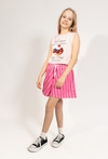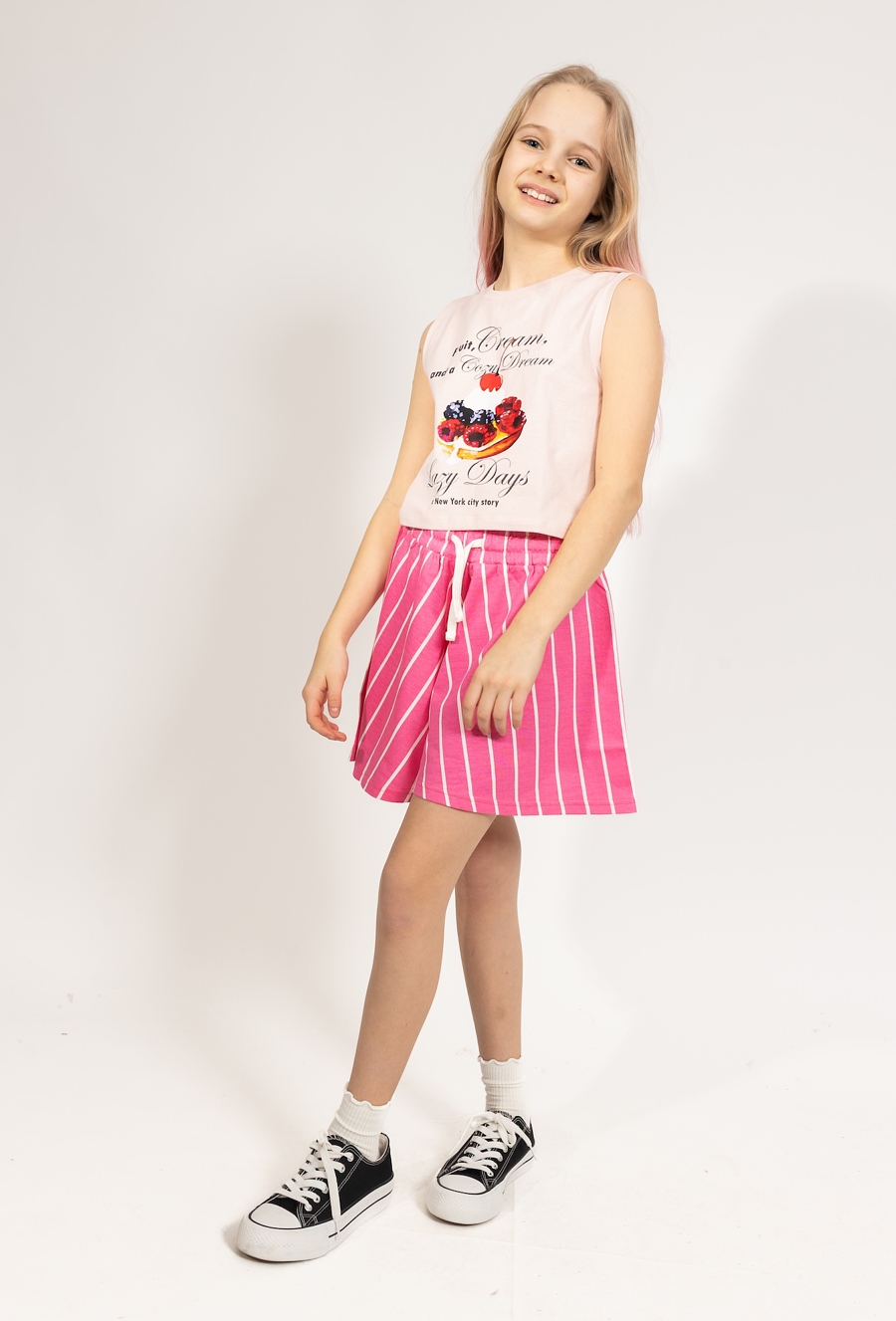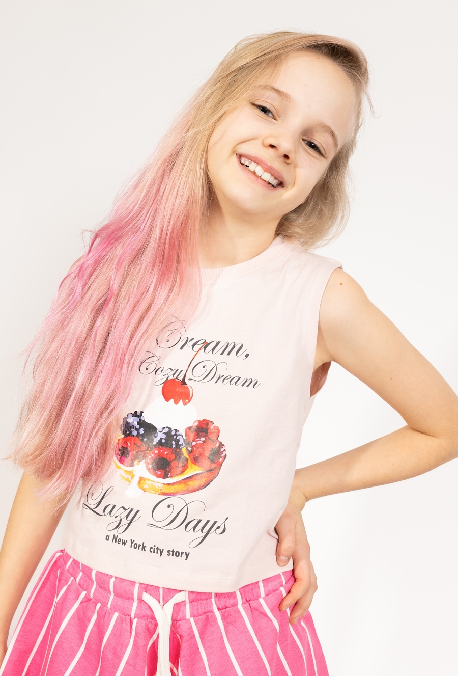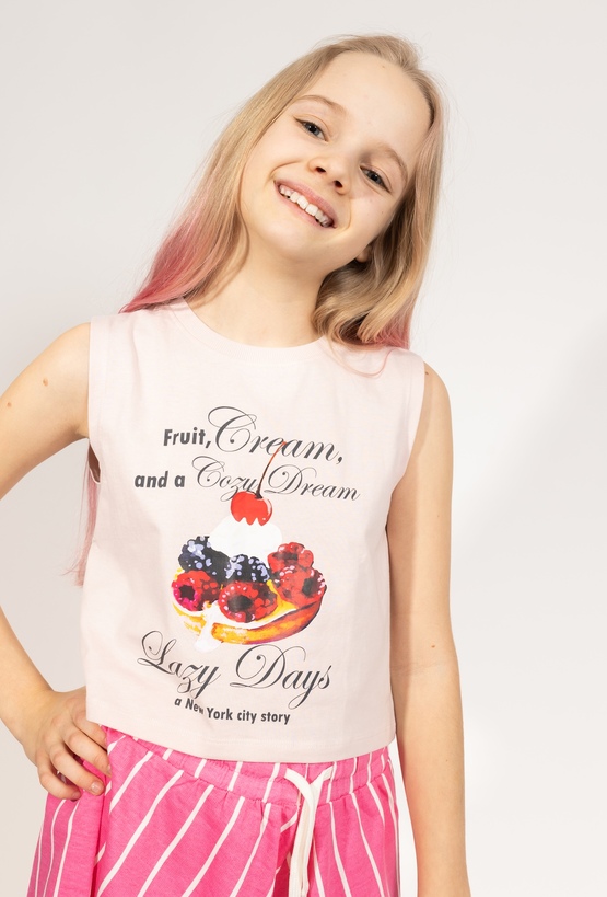 Ta różowa koszulka na ramiączka to idealna propozycja na ciepłe, wakacyjne dni, która łączy w sobie dziewczęcy styl z nutką luźnego charakteru. Model wyróżnia się wyrazistym, fotonadrukiem na przodzie, przedstawiającym deser z owocami leśnymi, takimi jak maliny i borówki, zwieńczony bitą śmietaną z wisienką. Całość dopełniają ozdobne napisy, w tym „Fruit, Cream, and a Cozy Dream” oraz „Lazy Days a New York city story”, które dodają koszulce wyjątkowego, miejskiego klimatu. Koszulka ma wygodny fason na szerokich ramiączkach, zapewniający komfort podczas codziennych aktywności. Jest to świetny element letniej garderoby, który doskonale komponuje się z szortami czy spódniczkami.