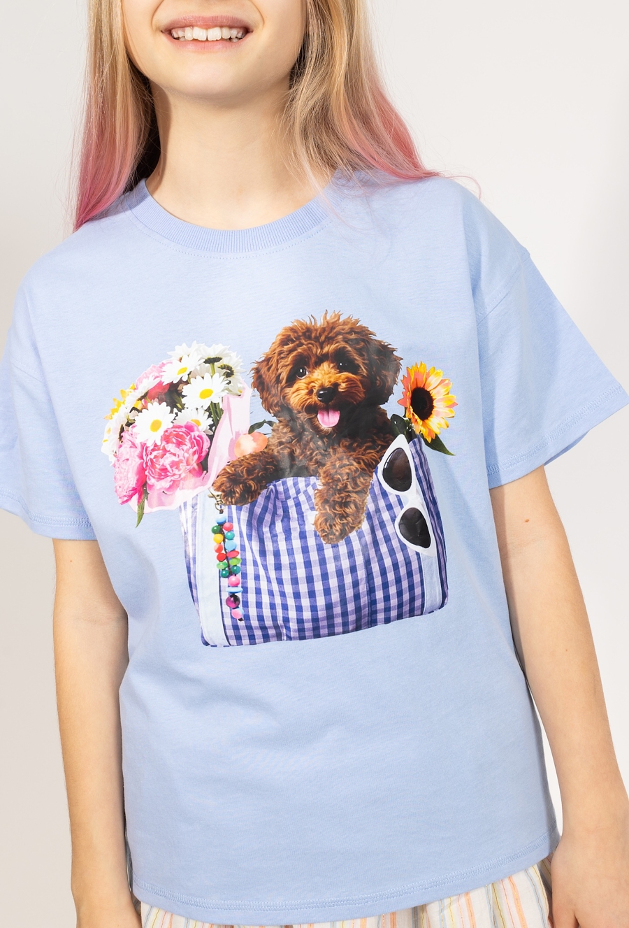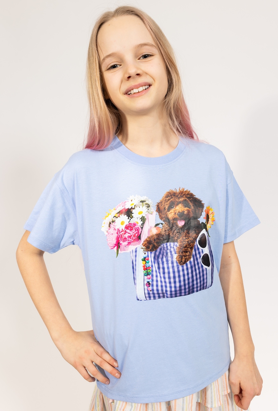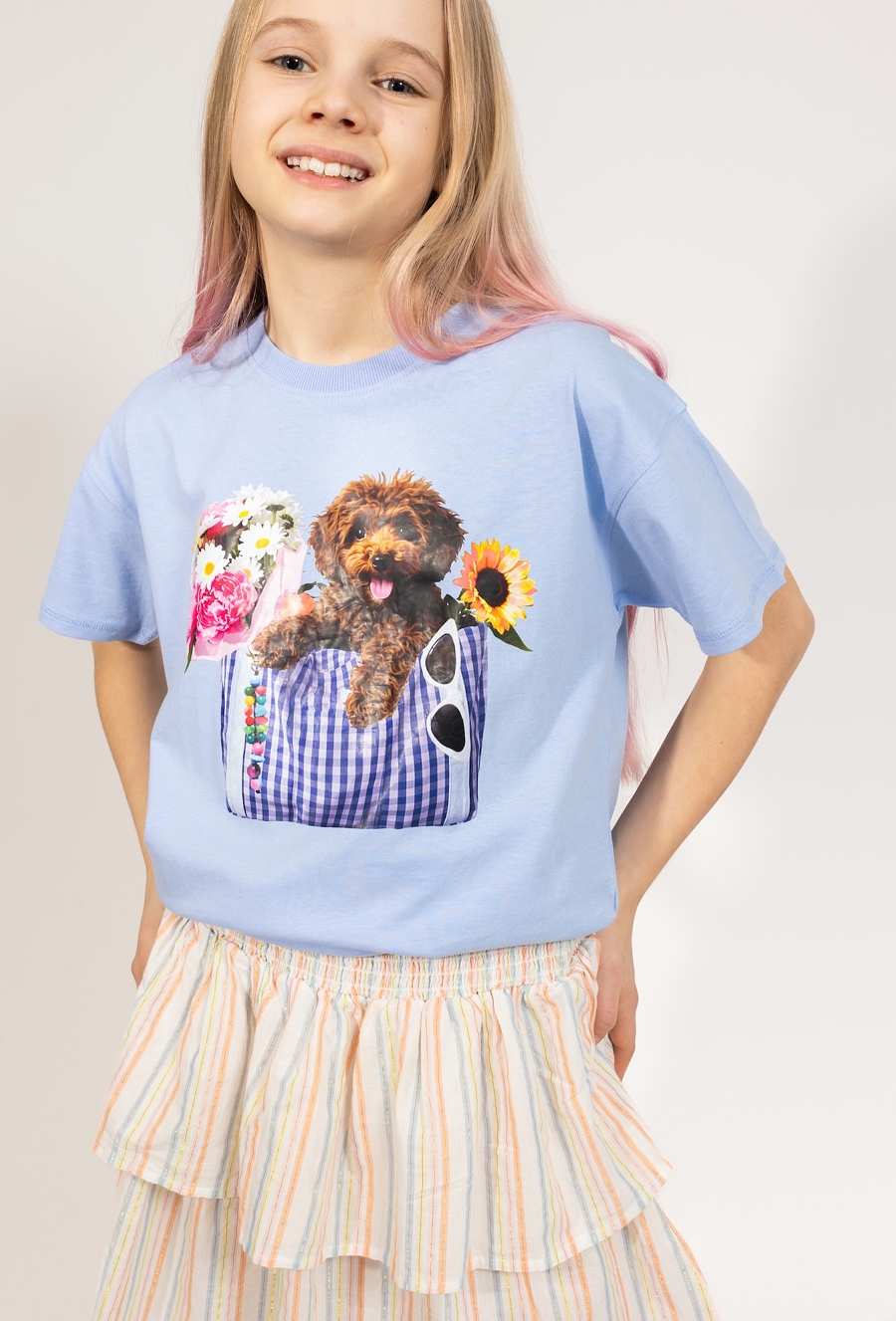 Ta niebieska koszulka to propozycja, która z pewnością wywoła uśmiech na twarzy każdej dziewczynki. Model wyróżnia się wysokiej jakości, zabawnym fotonadrukiem na przodzie, który przedstawia uroczego pieska siedzącego w stylowej, kraciastej torbie wypełnionej kolorowymi kwiatami. Koszulka ma klasyczny, wygodny fason z krótkim rękawem, co czyni ją idealnym wyborem na co dzień – do szkoły, na spotkania z przyjaciółkami czy wakacyjne spacery. Wykonana z dbałością o komfort, świetnie komponuje się zarówno ze spódniczkami, jak i ulubionymi jeansami czy szortami.