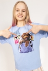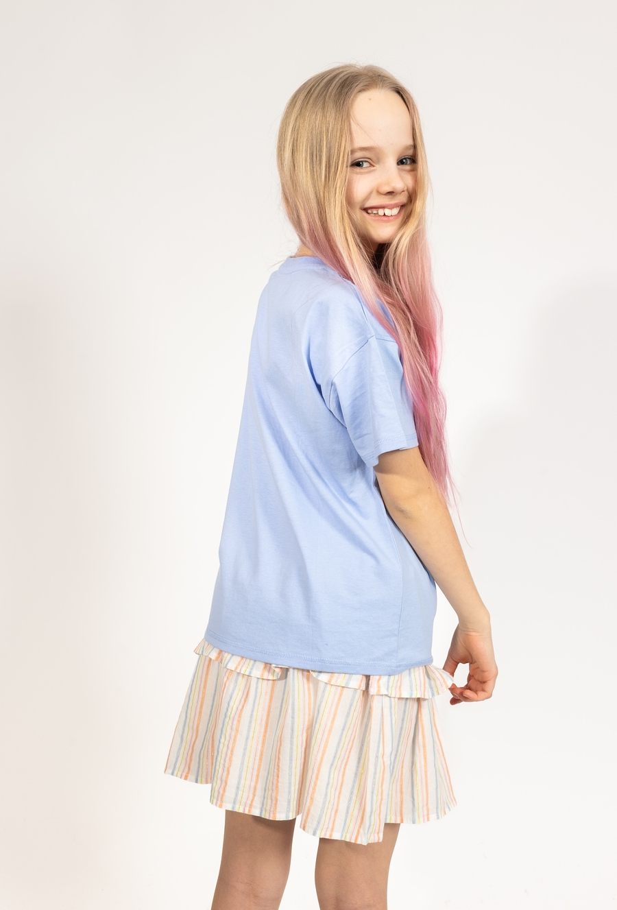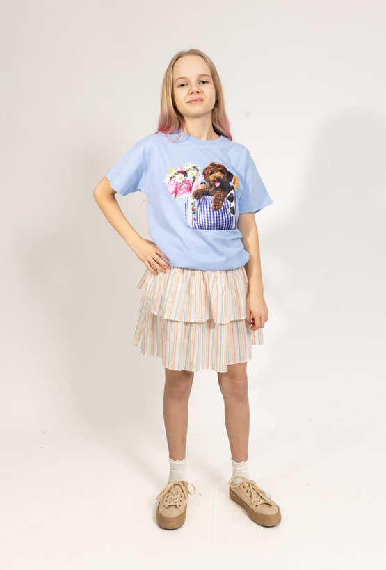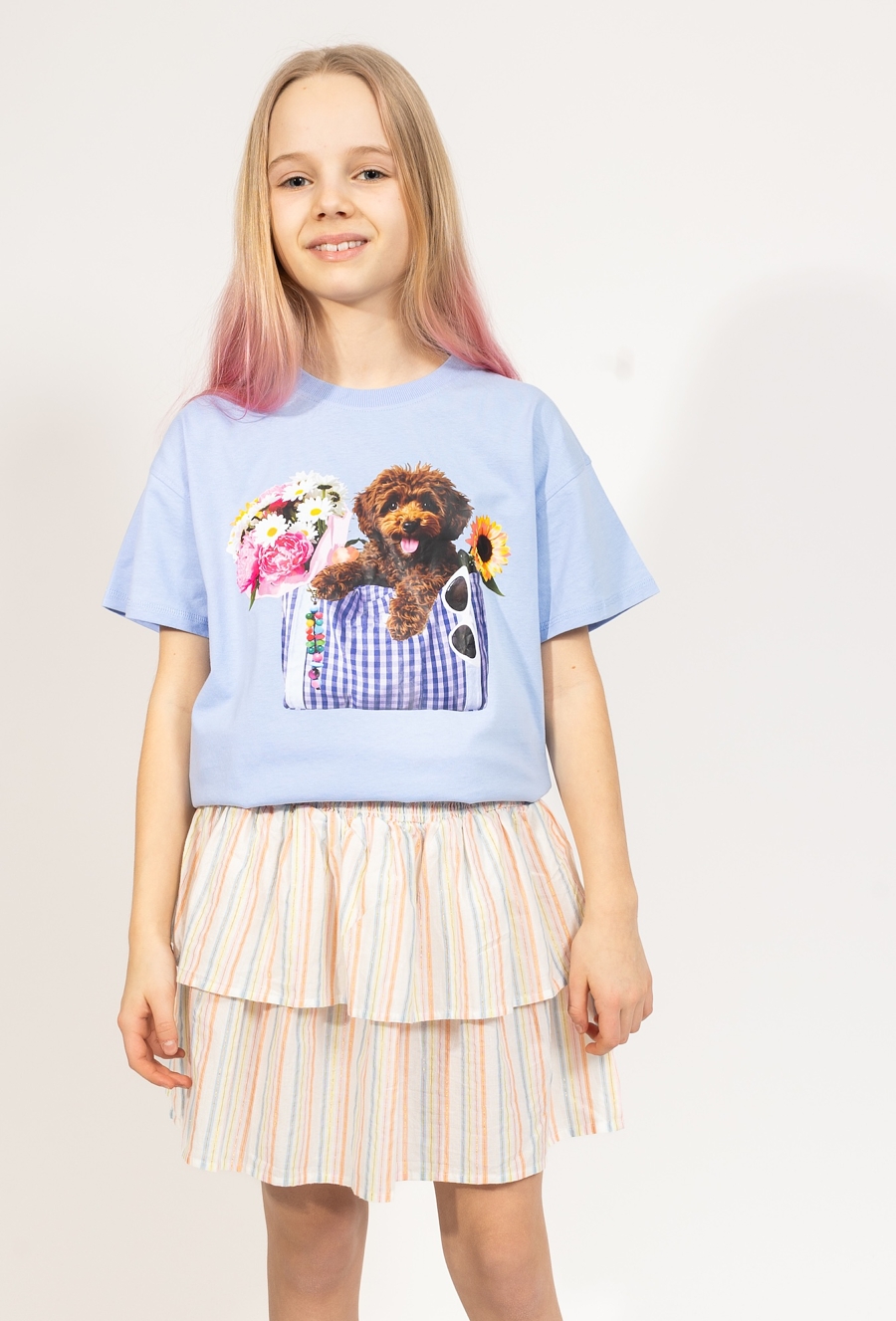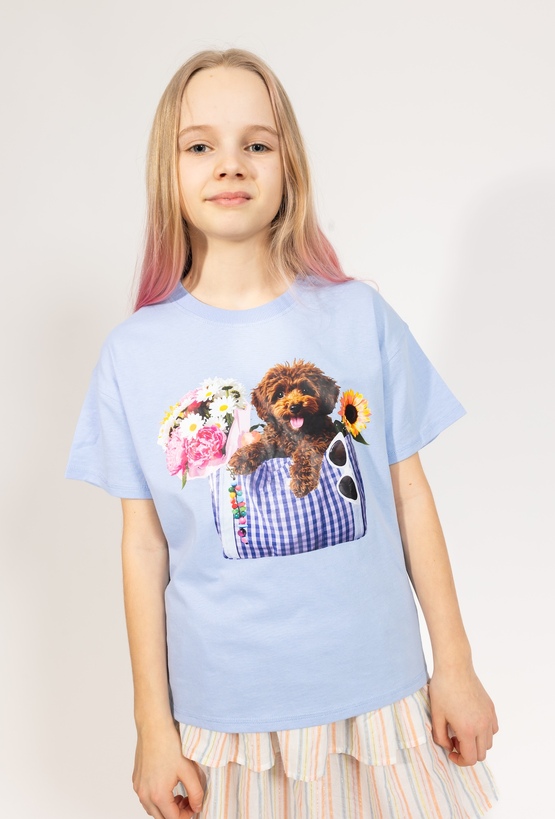 Ta niebieska koszulka to propozycja, która z pewnością wywoła uśmiech na twarzy każdej dziewczynki. Model wyróżnia się wysokiej jakości, zabawnym fotonadrukiem na przodzie, który przedstawia uroczego pieska siedzącego w stylowej, kraciastej torbie wypełnionej kolorowymi kwiatami. Koszulka ma klasyczny, wygodny fason z krótkim rękawem, co czyni ją idealnym wyborem na co dzień – do szkoły, na spotkania z przyjaciółkami czy wakacyjne spacery. Wykonana z dbałością o komfort, świetnie komponuje się zarówno ze spódniczkami, jak i ulubionymi jeansami czy szortami.