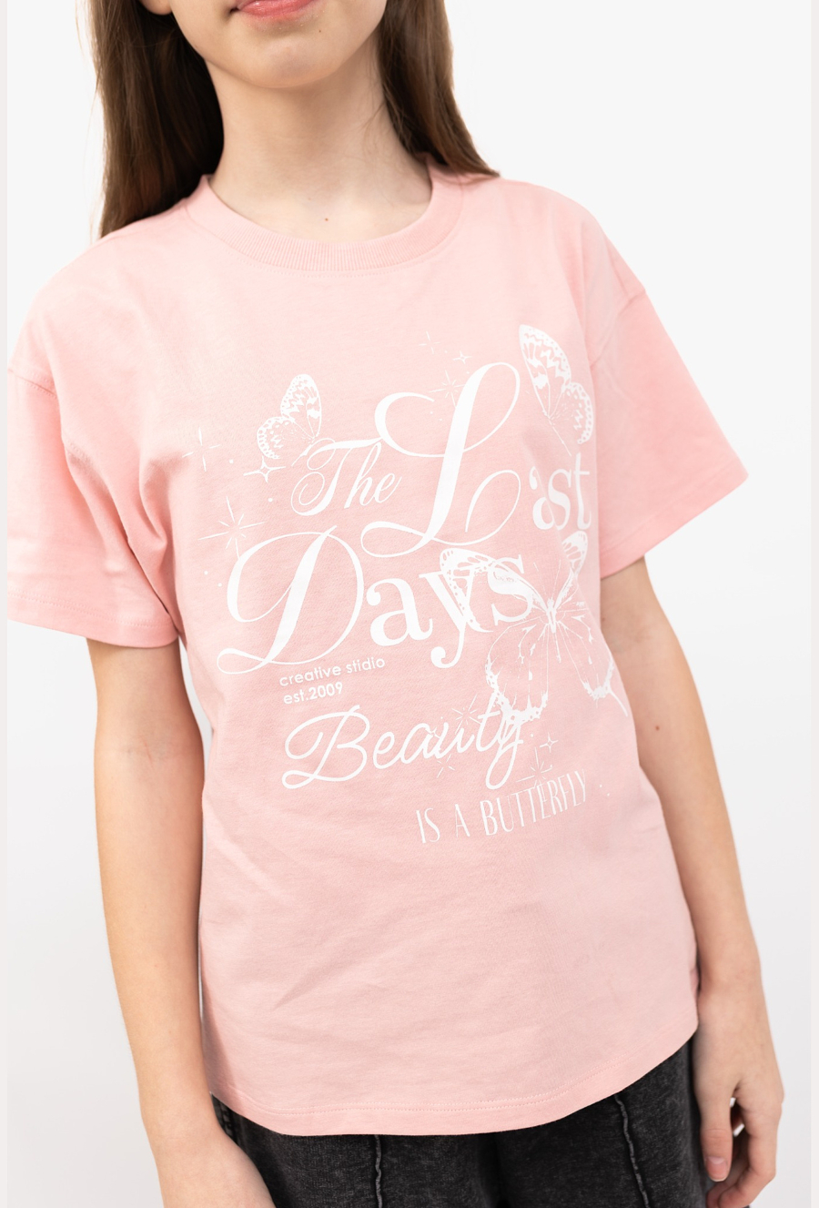 Różowa koszulka to lekki, wygodny wybór na każdy dzień. Uszyta z 100% bawełny, jest miękka, przewiewna i przyjemna dla skóry. Na przodzie znajduje się nadruk z motywem motyla, który dodaje całości delikatnego, dziewczęcego charakteru. Klasyczny krój sprawia, że t-shirt łatwo zestawić z ulubionymi spodniami, szortami czy spódnicą – do szkoły, na spacer i na wyjazd.