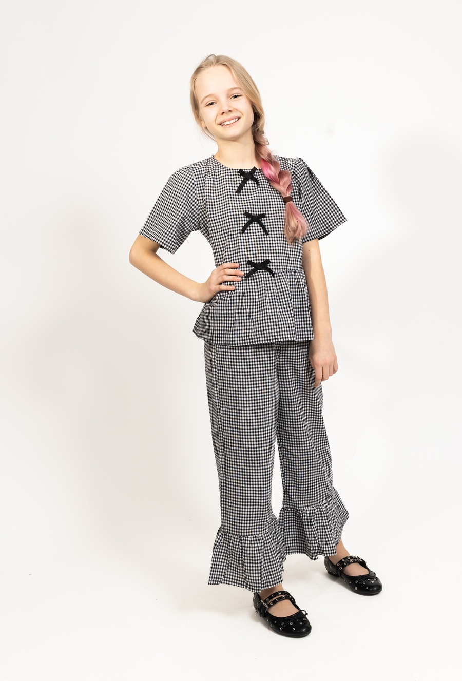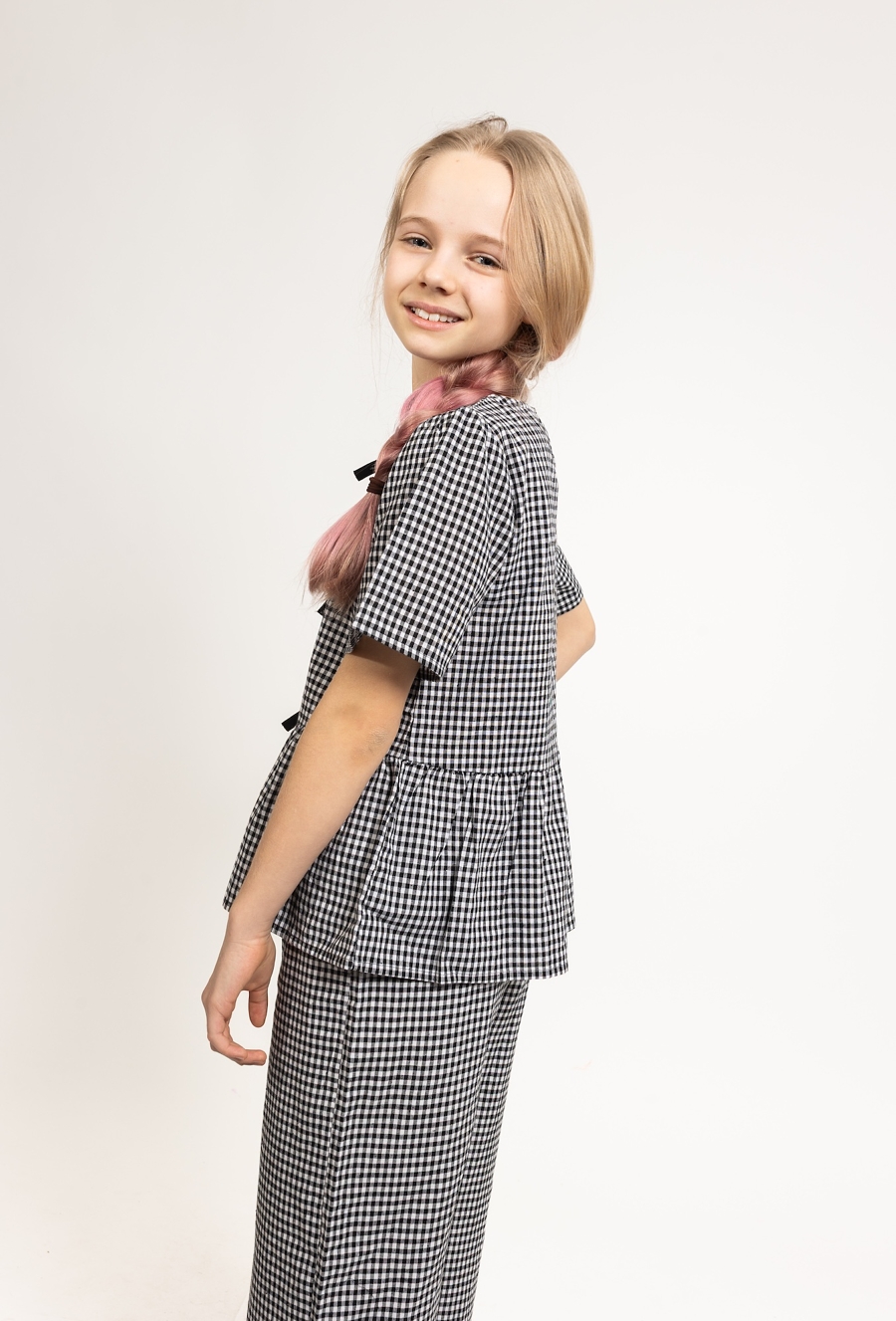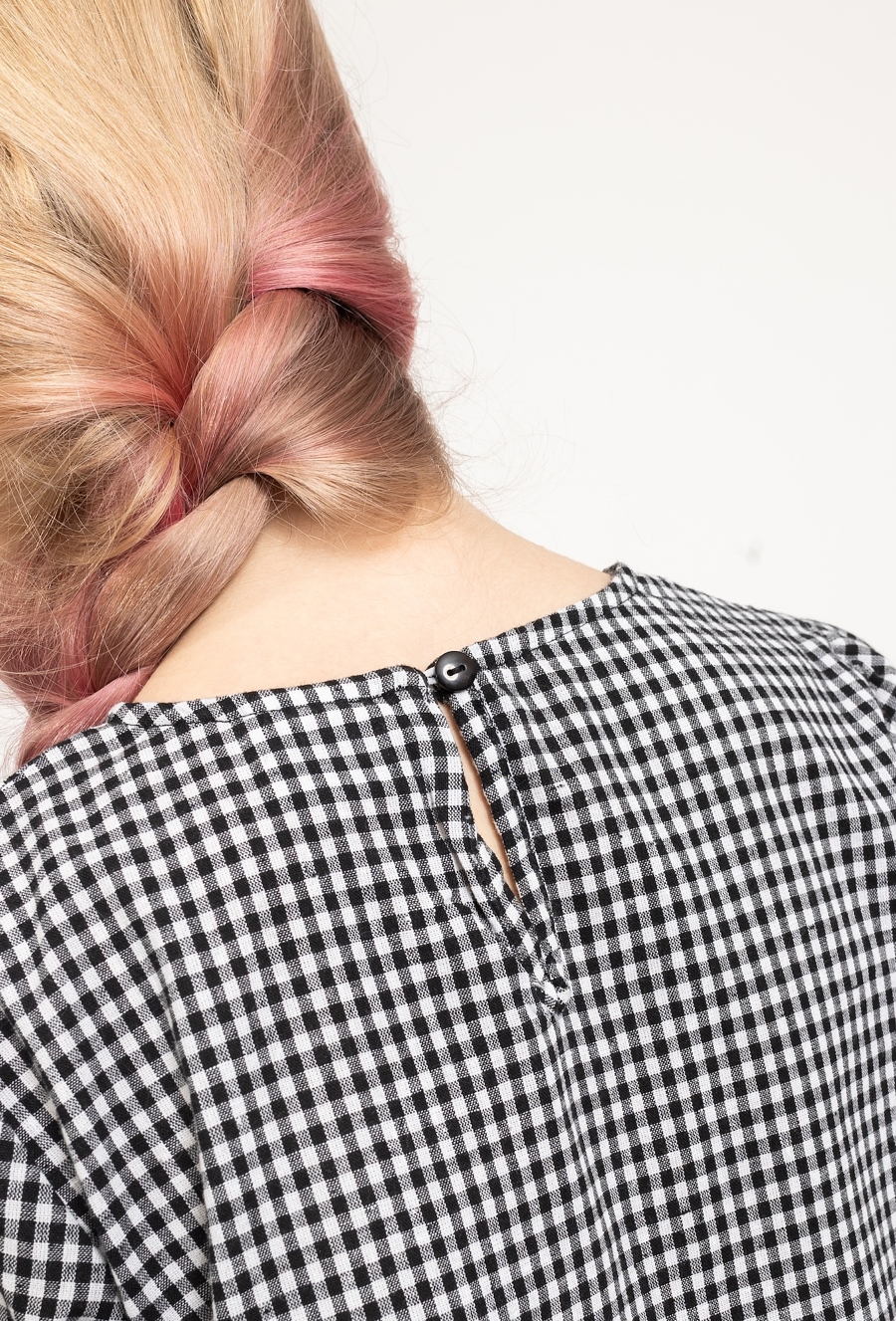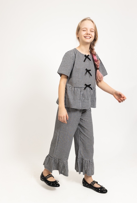 Lekkość i modny design na ciepłe dni. Ta bluzka o pudełkowym kroju została uszyta w 100% z bawełny. Dekoracyjne kokardki oraz dziewczęca falbanka u dołu nadają jej wyjątkowego, uroczego charakteru, a klasyczna czarno-biała kratka sprawia, że pasuje do wielu stylizacji. To idealna propozycja dla dziewczynek, które cenią sobie styl i komfort każdego dnia.