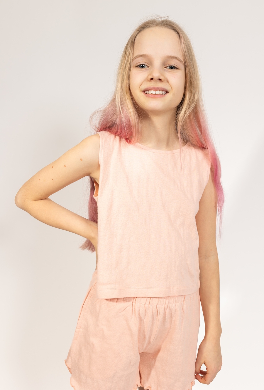 Ta urocza koszulka w kolorze subtelnego różu to połączenie wygody i wyjątkowego designu. Wykonana z miękkiej dzianiny bawełnianej o widocznej, strukturalnej fakturze, zapewnia dziecku pełen komfort noszenia przez cały dzień, jednocześnie wyglądając niezwykle stylowo. To idealna baza do stworzenia radosnej, letniej stylizacji. Doskonale komponuje się z szortami, spódniczkami lub jeansami, a efektowne plecy sprawią, że Twoja córeczka poczuje się wyjątkowo.