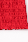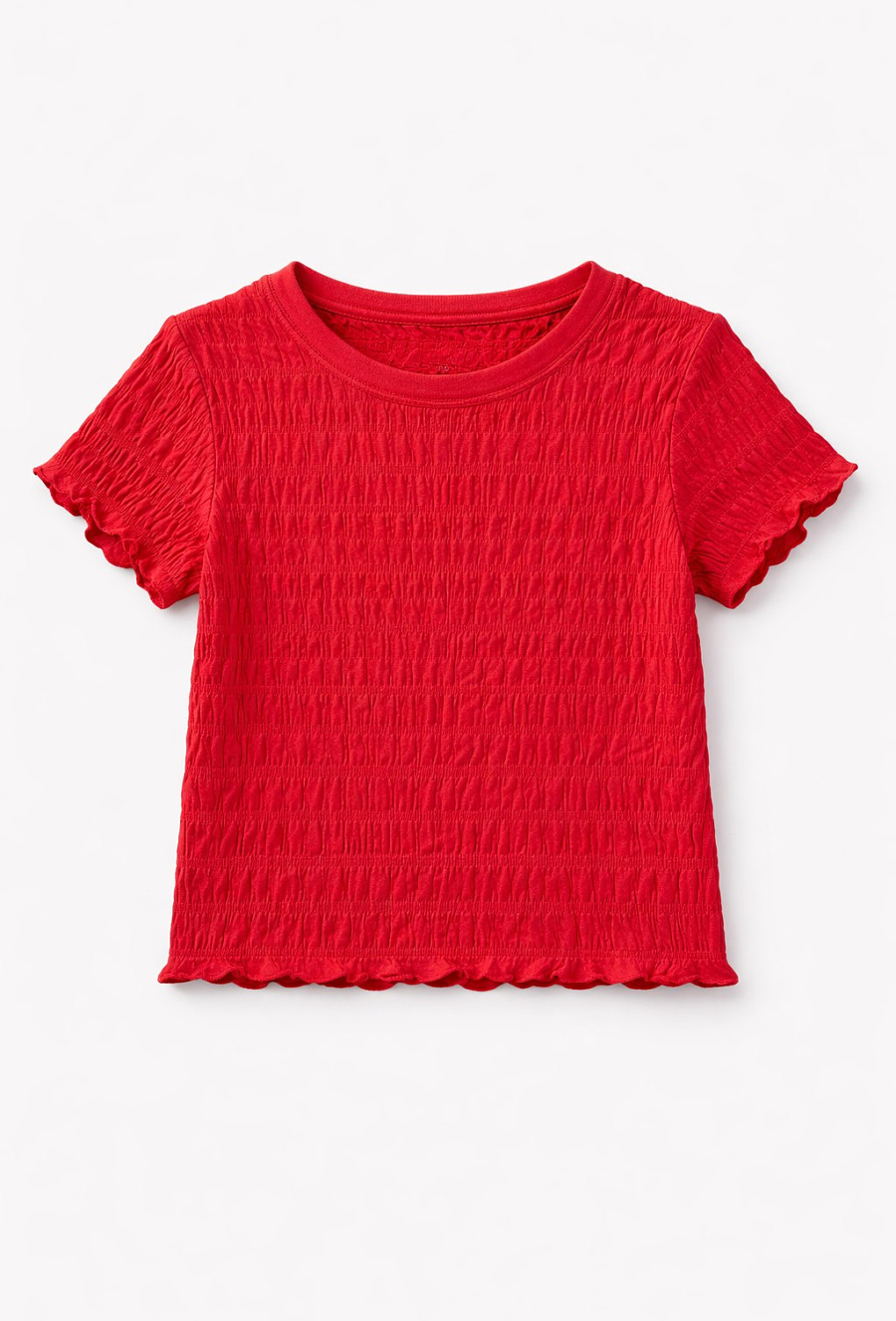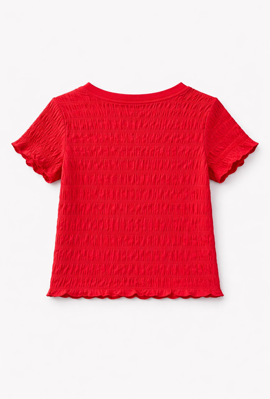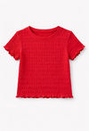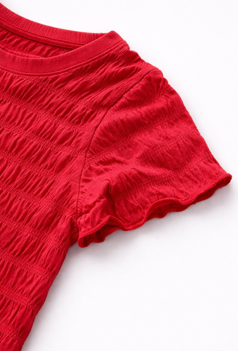 Efektowna czerwona koszulka z marszczonej dzianiny dla dziewczynki. Dodaj energii codziennym stylizacjom swojego dziecka dzięki tej wyrazistej koszulce w kolorze intensywnej czerwieni. Model ten wyróżnia się unikalną teksturą materiału, która nadaje mu nowoczesny i modny wygląd. Wykonanie w 95% z bawełny z dodatkiem 5% elastanu gwarantuje, że koszulka jest niezwykle miękka, przewiewna i idealnie dopasowuje się do sylwetki, nie krępując ruchów podczas zabawy. Dzięki swojemu dopasowanemu krojowi i efektownej strukturze, koszulka świetnie prezentuje się zarówno z klasycznymi jeansami, jak i sportowymi legginsami.