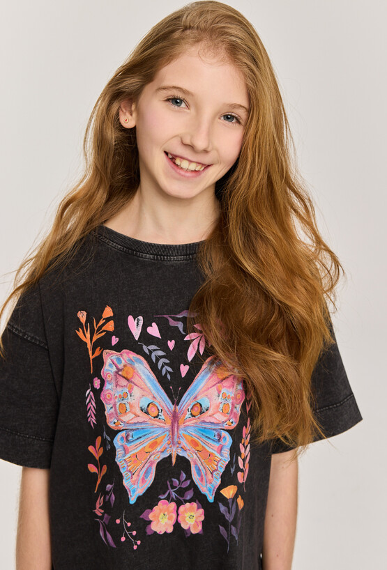 Szara koszulka oversize to połączenie wygody i modnego, luźnego stylu. Wykonana w 100% z bawełny, jest przewiewna i przyjemna dla skóry. Efekt sprania nadaje jej casualowy charakter, a kolorowy nadruk z motywem motyla przyciąga uwagę i dodaje stylizacji energii. To świetny wybór na co dzień – do jeansów, legginsów czy szortów.