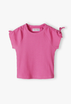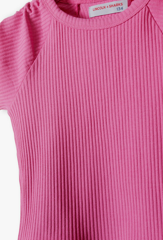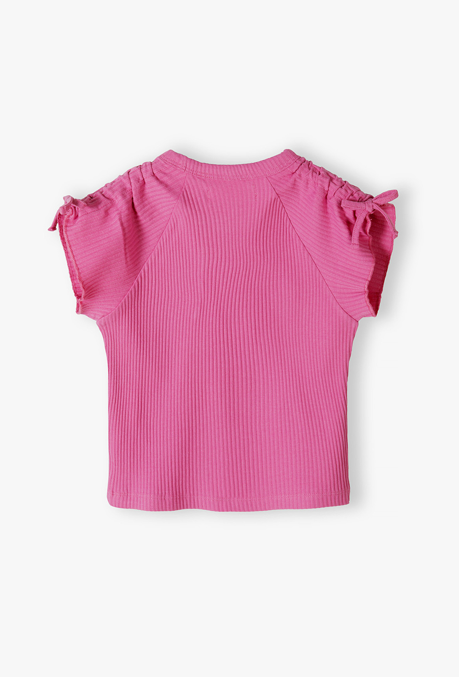 Postaw na wyrazisty kolor i modną strukturę! Ta intensywnie różowa koszulka to idealny wybór dla dziewczynek, które chcą wyróżnić się z tłumu i cenią sobie ubrania z ciekawymi detalami. Dzięki elastycznemu materiałowi i nowoczesnemu krojowi, T-shirt ten stanie się ulubioną bazą letnich stylizacji. Koszulka została wykonana z prążkowanej dzianiny, która jest nie tylko stylowa, ale też bardzo elastyczna. Materiał świetnie dopasowuje się do sylwetki, zapewniając pełen komfort i swobodę ruchów. Ramiona koszulki zdobią efektowne marszczenia zakończone uroczymi troczkami z kokardkami. To detal, który nadaje prostej koszulce unikalnego, dziewczęcego charakteru.