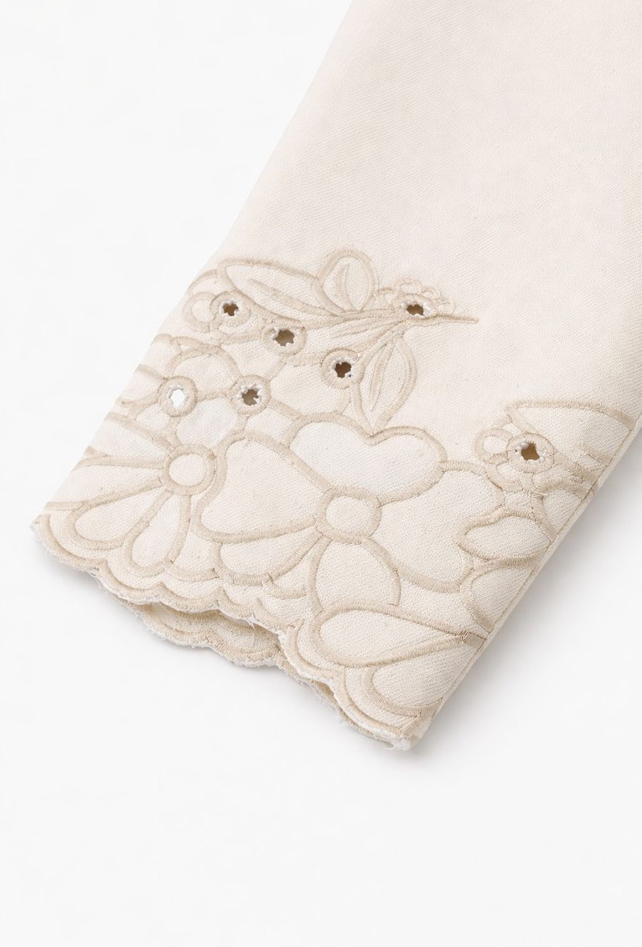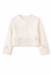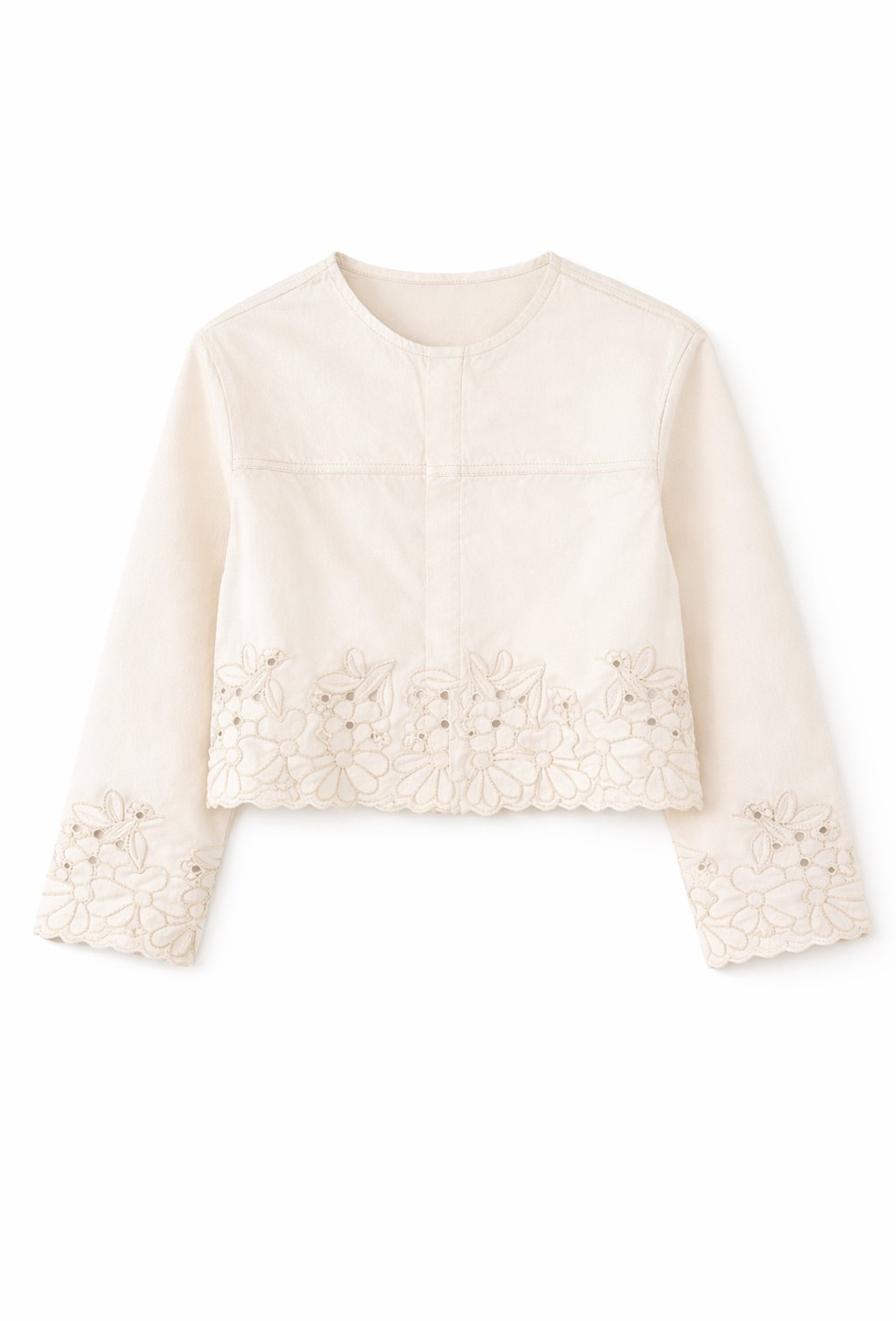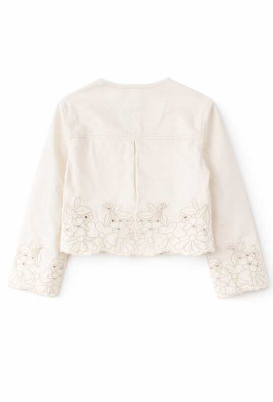 Ta jasna kurtka jeansowa to połączenie klasyki z wyjątkowymi detalami, które nadają całości niepowtarzalnego stylu. Model został ozdobiony subtelnym, ażurowym haftem z motywem kwiatowym, który znajduje się zarówno na dole kurtki, jak i na końcach rękawów. Kurtka zapinana jest na praktyczne napy, co zapewnia łatwość zakładania. Wykonana z denimu, łączy trwałość z elegancją, dzięki czemu sprawdzi się w wielu wiosennych i letnich stylizacjach.