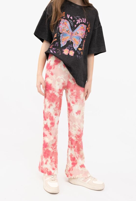 Dziewczęce legginsy prążkowane tie-dye z modnie rozszerzaną nogawką flare. Wykonane z elastycznej dzianiny (95% bawełna, 5% elastan), są miękkie i wygodne. Miękka guma w pasie zapewnia komfort noszenia przez cały dzień. Świetne do t-shirtów, bluz i oversize’owych koszulek.