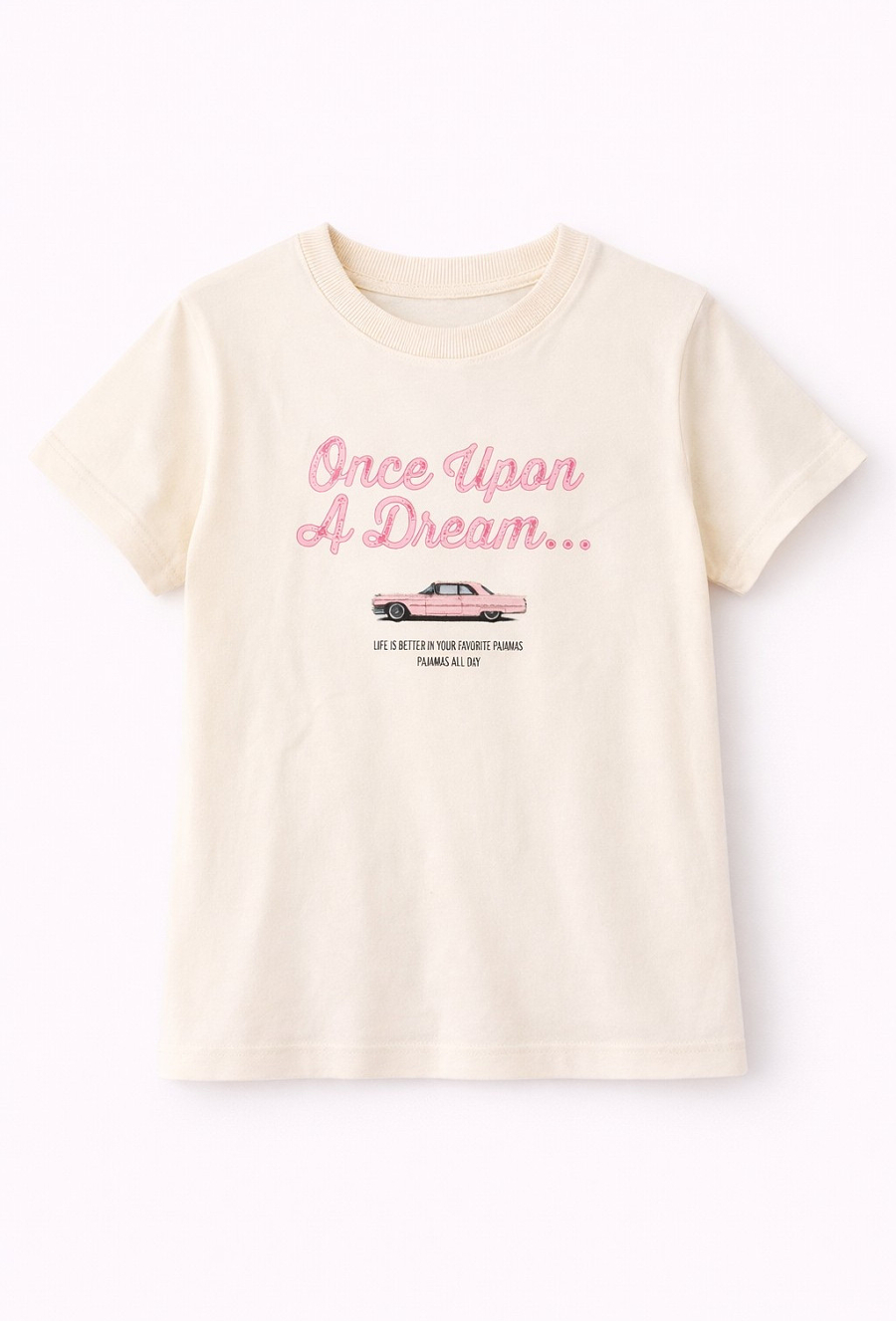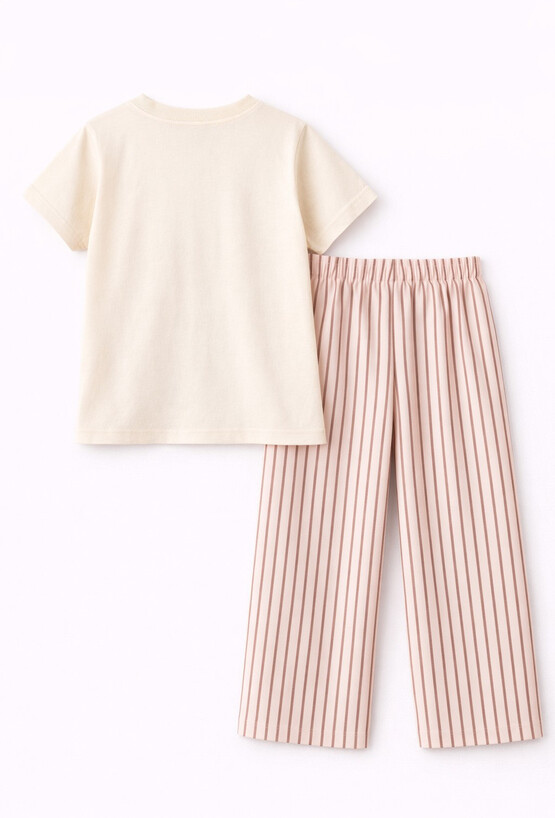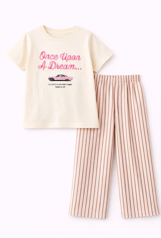 Przenieś swoją córkę w świat marzeń dzięki tej wyjątkowej piżamie, która łączy modny styl vintage z najwyższym komfortem snu. Koszulka w ciepłym, waniliowym odcieniu z klasycznym, okrągłym dekoltem. Przód zdobi stylowy fotonadruk przedstawiający klasyczny, różowy kabriolet oraz napis „ONCE UPON A DREAM...”. Poniżej znajduje się inspirujące hasło: „Life is better in your favorite pajamas”, co nadaje piżamie unikalnego charakteru. Wyjątkowo komfortowe spodnie o prostym kroju, ozdobione klasycznym wzorem w pionowe, brązowe paski na stonowanym, różowo-beżowym tle. Elastyczny pas gwarantuje idealne dopasowanie do sylwetki dziecka, nie powodując ucisku podczas snu.