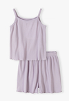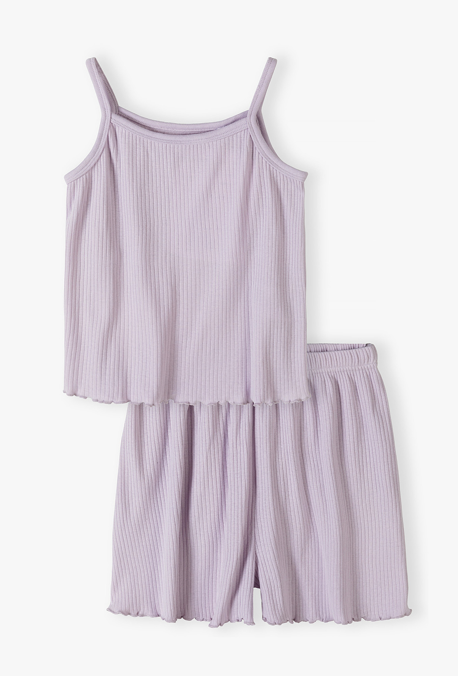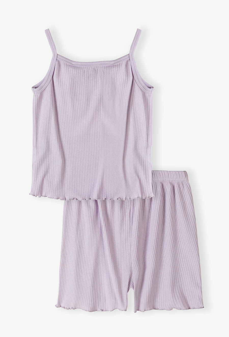 Postaw na lekkość i styl nawet podczas snu! Ta fioletowa piżama to idealna propozycja dla dziewcząt, które cenią sobie nowoczesny wygląd i wyjątkową wygodę. Wykonana z elastycznej, prążkowanej dzianiny, zapewnia pełną swobodę ruchów i doskonałą wentylację w ciepłe, letnie noce. Dzianina o wyraźnym prążkowaniu to jeden z najgorętszych trendów. Jest nie tylko stylowa, ale również bardzo elastyczna, dzięki czemu piżama idealnie dopasowuje się do sylwetki, nie krępując ruchów. Luźne spodenki z elastycznym pasem zapewniają komfort noszenia bez ucisku. Nogawki szortów, podobnie jak dół koszulki, wykończone są uroczym, falowanym ściegiem, który dodaje całości dziewczęcego wdzięku.